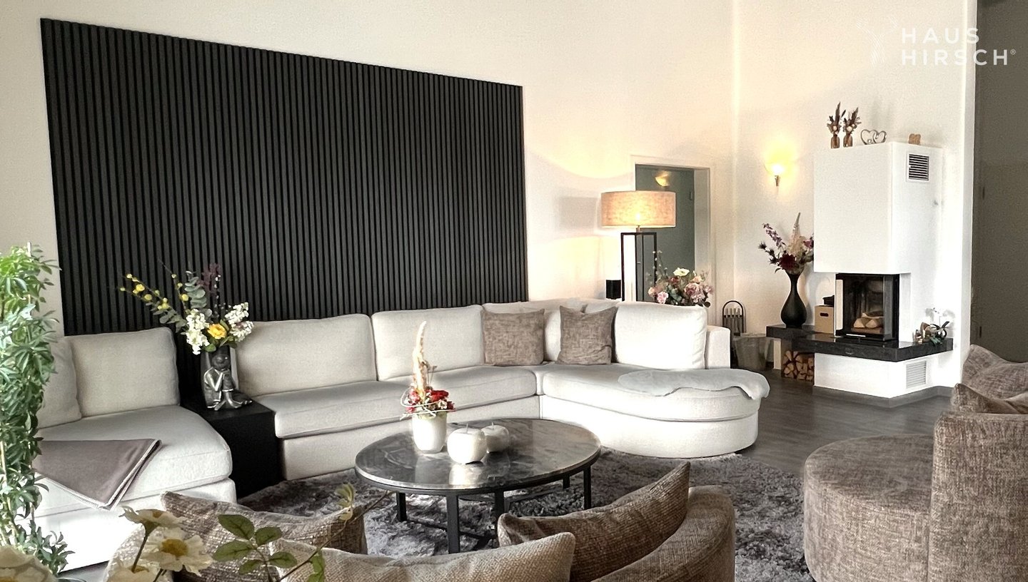 • Kamin: Der eindrucksvolle Kamin im Wohnzimmer schafft eine behagliche Atmosphäre an kühlen Abenden.