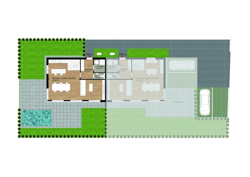 Die Grundrissgestaltung ist durchdacht und bietet Flexibilität für verschiedene Lebensstile. Ein besonderes Highlight ist der offene Wohn- und Essbereich mit zahlreichen Gestaltungsmöglichkeiten. Die äußere Gestaltung mit einem kleinen Garten ermöglicht es auch Naturliebhabern, ihre persönliche Oase im Freien zu schaffen.