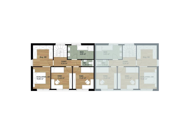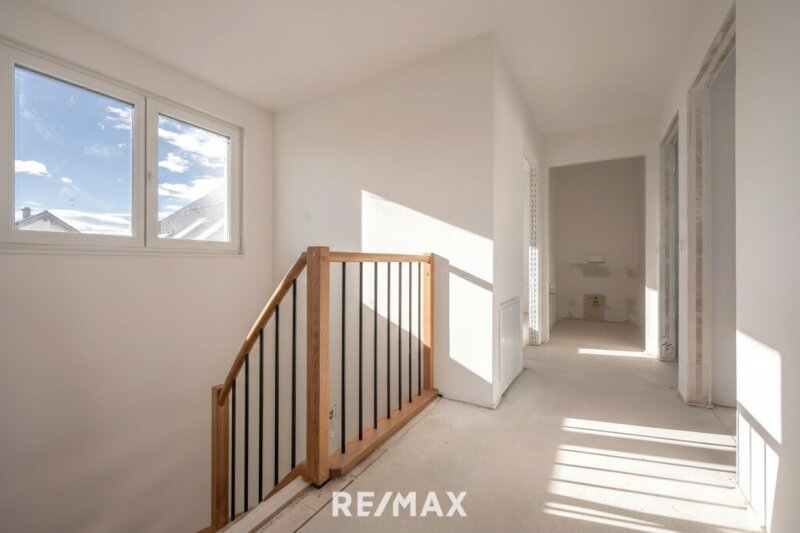 Im Obergeschoss stehen vier Zimmer sowie ein geräumiges Bad mit Fenster (vorbereitet für eine Walk-in-Dusche, eine Badewanne sowie zwei Waschtische) und ein separates WC zur Verfügung.