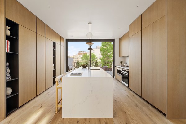 Ein mit Schlüssel ausgestatteter Aufzug öffnet sich direkt in eine Wohnetage mit einer auffälligen offenen Küche, geschmückt mit maßgefertigten Scavolini-Schränken und einer dramatischen Wasserfallinsel. Eine hochwertige integrierte Gerätesuite umfasst jeweils zwei nebeneinander angeordnete 36-Zoll-Kühlschrank- und Gefrierspalten sowie ein professionelles Kochfeld und einen Elektroofen. Eine mit Glasrahmen umrahmte Treppe führt zum darüberliegenden Dach, flutet den Eingang mit Tageslicht und dient als skulpturales architektonisches Herzstück.