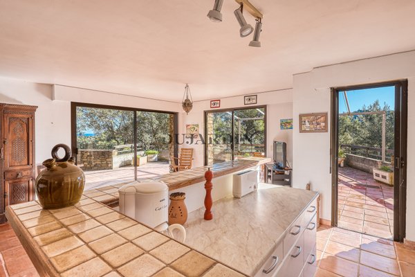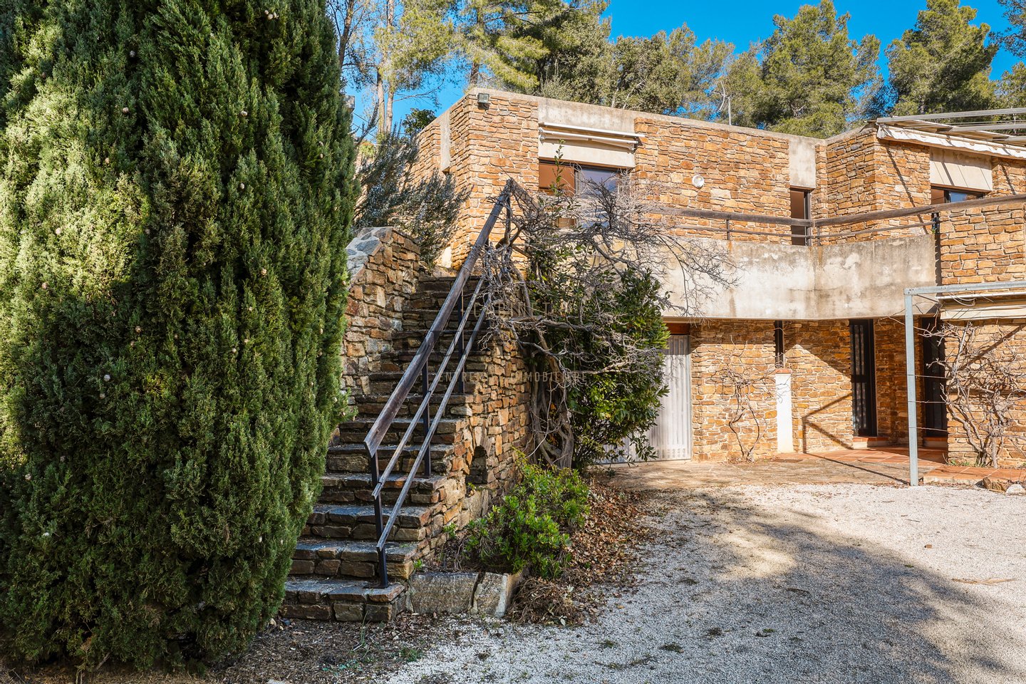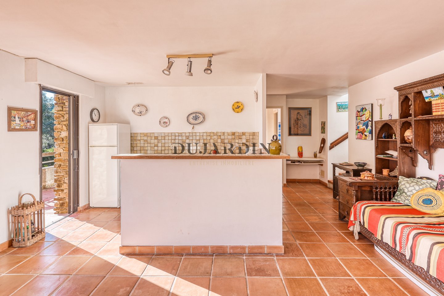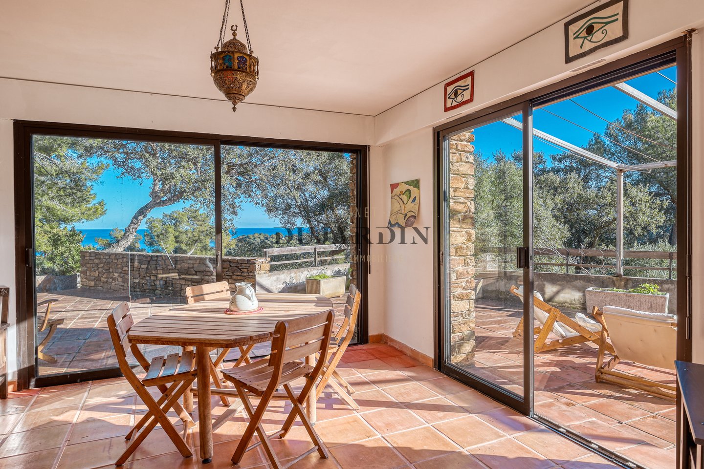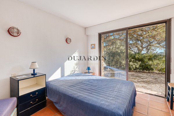 Obwohl es nur wenige Gehminuten vom Strand entfernt ist, umfasst dieses kubische Haus aus Bormes-Steinen ein Haupthaus, das aus einem nach Süden ausgerichteten Wohnzimmer besteht, das sehr hell und durch eine Terrasse von mehr als 80 m² erweitert wird, einer offenen Küche, einem Büroraum, zwei Schlafzimmern mit eigenen Badezimmern und einer separaten Toilette. Auf Gartenebene bietet eine unabhängige Wohnung von 41 m² ein Wohnzimmer mit offener Küche, einem Schlafzimmer, einem Badezimmer und einer Toilette. Eine große Garage vervollständigt dieses Level.
