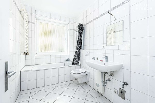 Links, in den Innenhof liegend, befindet sich das großzügige Wannenbad mit Tageslicht. Hier können Sie auch bequem eine Waschmaschine und einen Trockner unterbringen.
