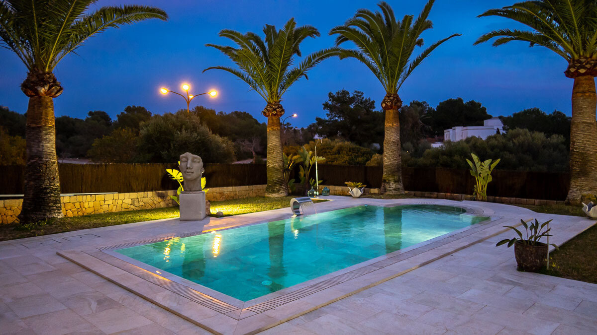 Diese mediterrane, renovierte Villa mit Vermietungslizenz befindet sich in einer ruhigen Villenwohnlage nahe Portopetro, einem luxuriösen Wohngebiet und beliebten Urlaubsort mit malerischen Badebuchten, kinderfreundlichen Sandstränden und mehreren