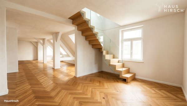 Über eine hochwertige Treppe (wahlweise massives Eichenholz, Stahl oder Glas) gelangen Sie in den spektakulärsten Teil der Wohnung.