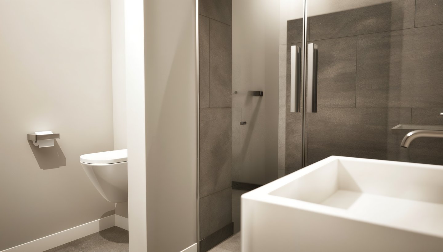 •Designbad mit großformatigen Fliesen (wahlweise Grigio, Schiefer Cream, Sand, Warmbraun etc.)