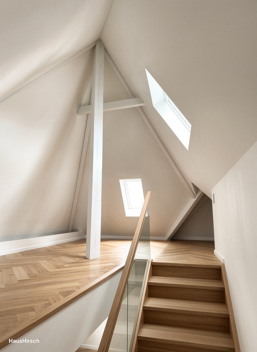 Eine hochwertige Treppe führt hinauf in die zweite Ebene, wo sich der Altbau-Charme durch Sichtbalken und Dachschrägen voll entfaltet.