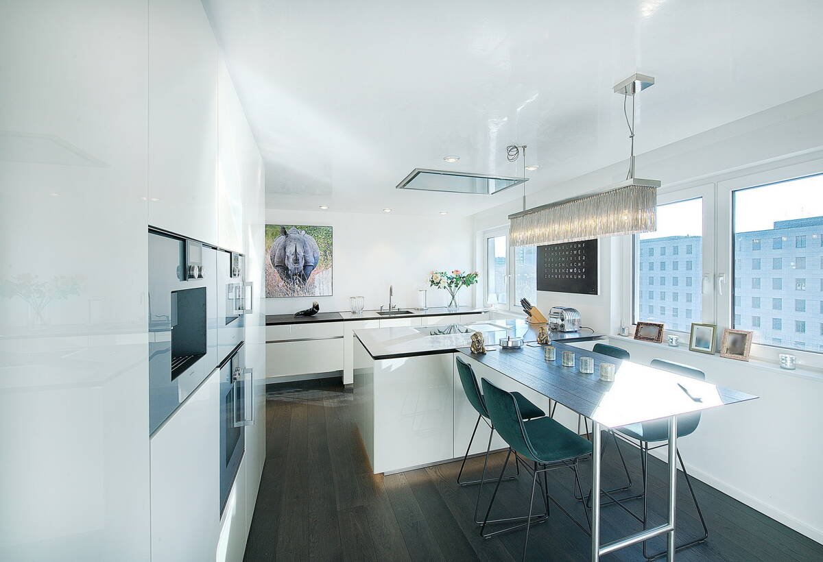 Die Boffi-Küche ist ein Meisterstück des Designs: maßgefertigte Einbauten, elegante Arbeitsflächen aus gebürstetem Edelstahl, modernste Einbaugeräte der Marke Gaggenau, sowie durchdachte Stauraumlösungen machen sie zum Herzstück der Wohnung. Indirekte Beleuchtungssysteme und stilvolle Details verbinden Funktionalität mit exklusiver Optik.