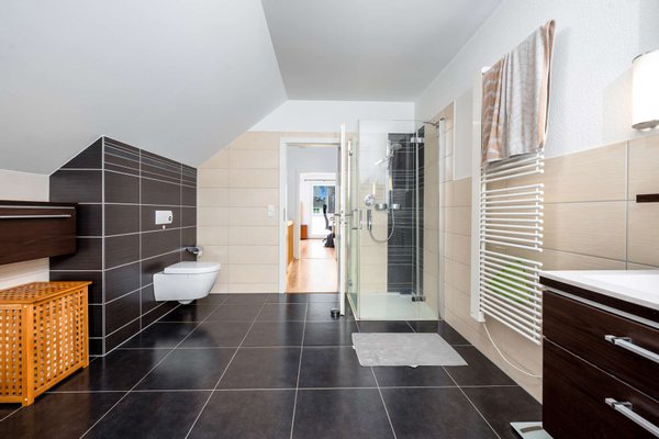 + Großes Badezimmer mit Badewanne und Dusche, ausgestattet mit Keramiken von Villeroy & Boch
