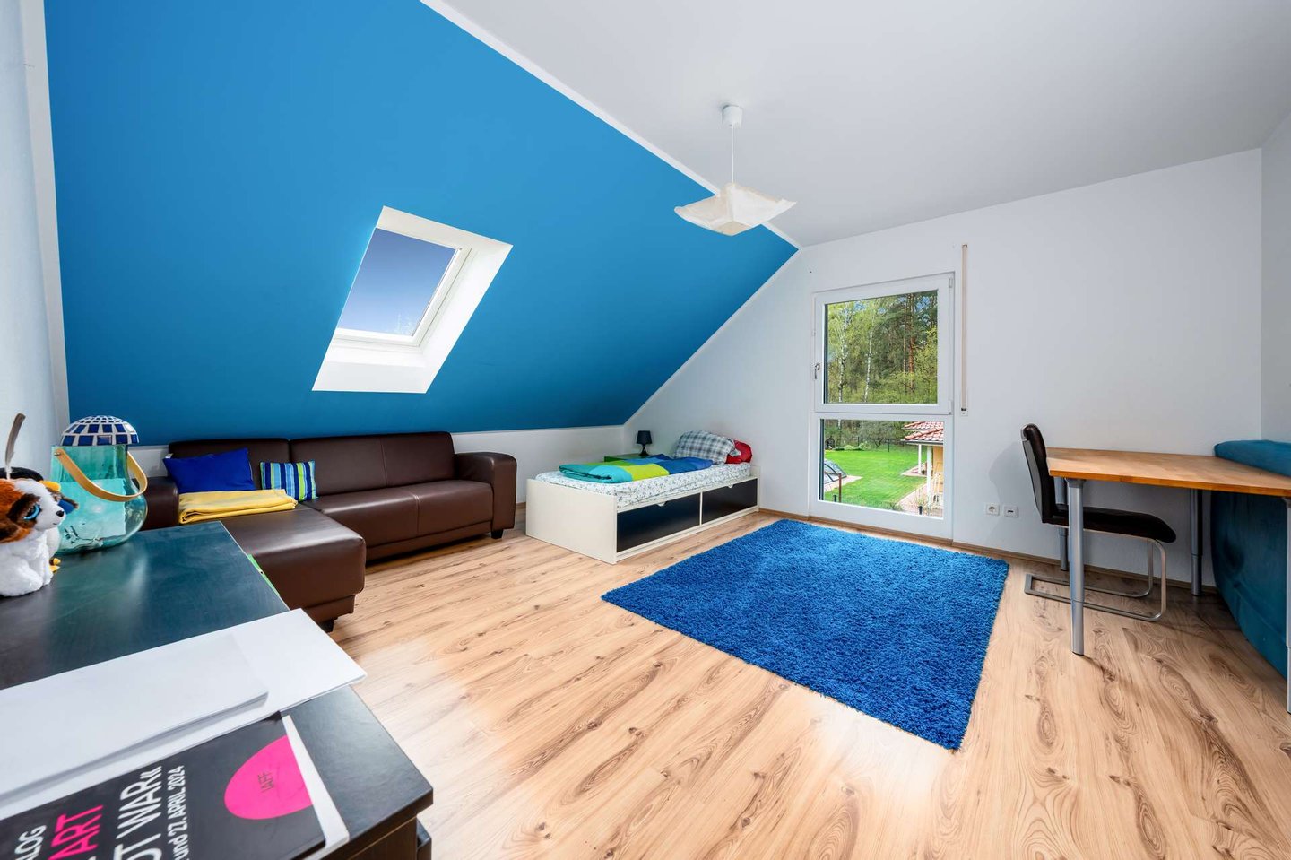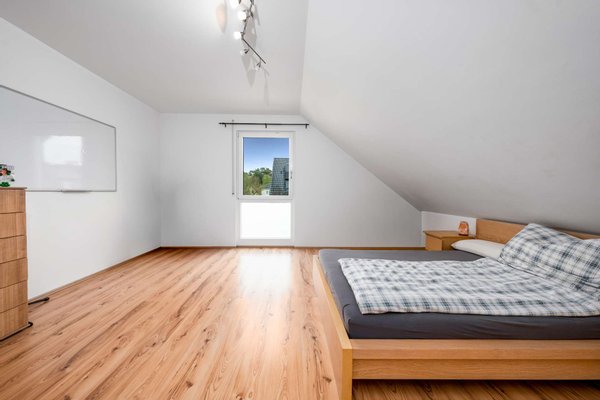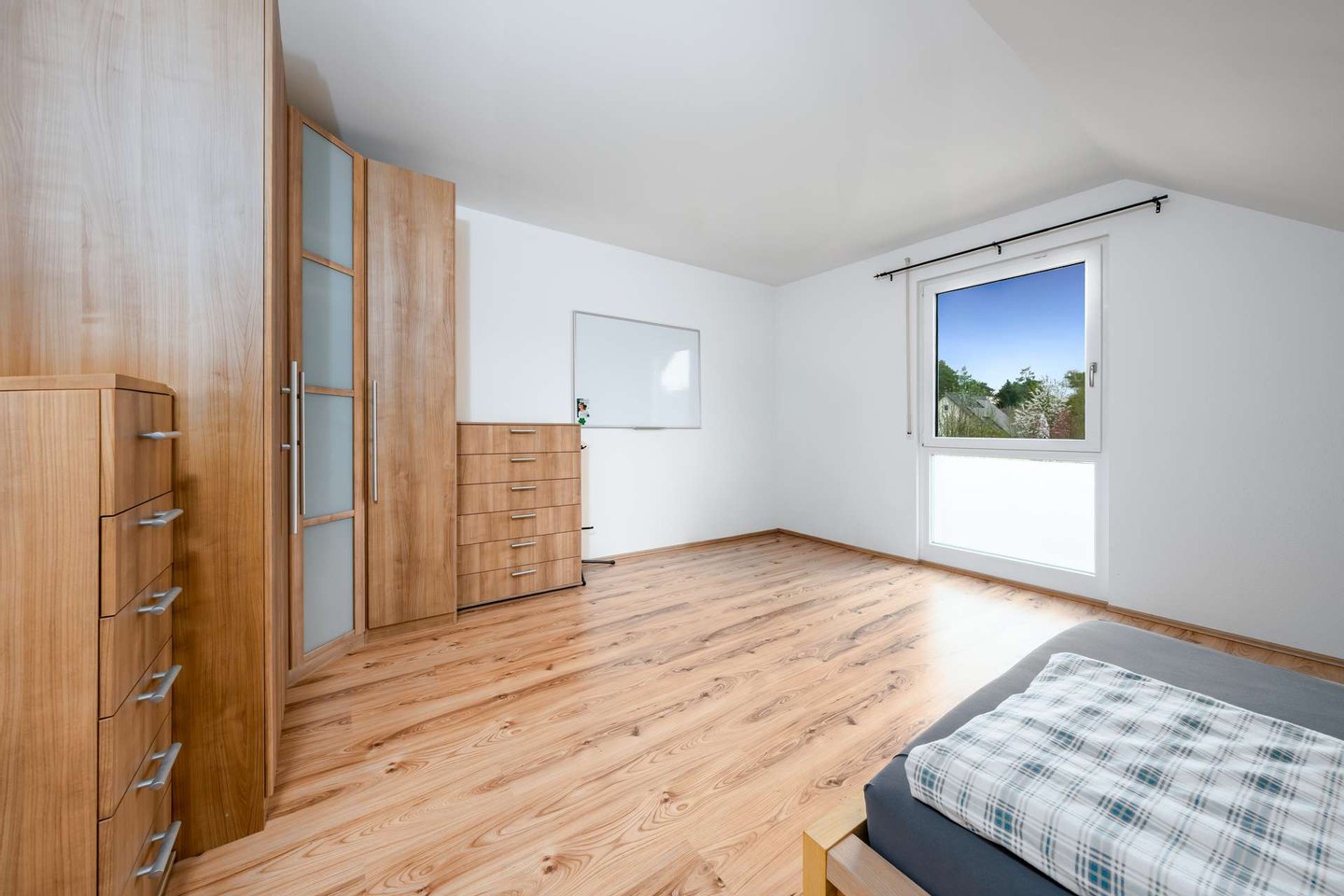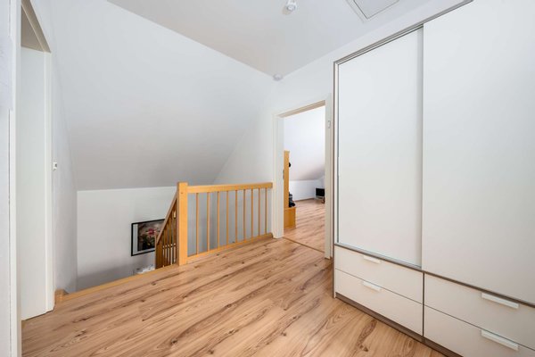 Im Obergeschoss befindet sich das großzügige Elternschlafzimmer mit einem angrenzenden Raum, der sich hervorragend als begehbarer Kleiderschrank nutzen lässt. Zwei weitere Zimmer bieten vielseitige Nutzungsmöglichkeiten – ideal als Kinder-, Gäste- oder Arbeitszimmer. Das geräumige Badezimmer überzeugt mit Badewanne, Dusche und hochwertiger Ausstattung von Villeroy & Boch.