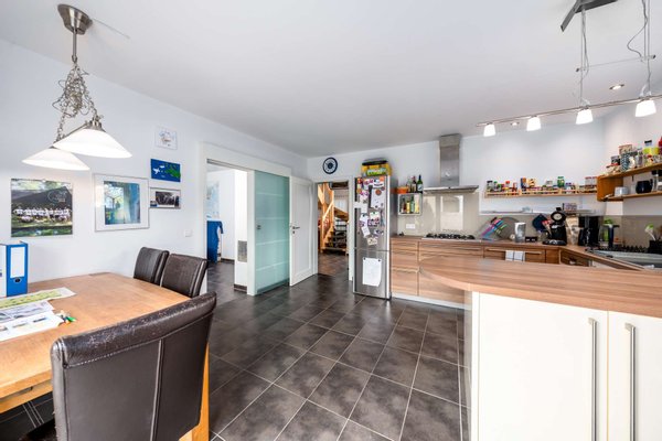 Im Erdgeschoss erwartet Sie ein praktischer Hauswirtschaftsraum mit allen wichtigen Medienanschlüssen sowie Platz für Waschmaschine und Trockner. Die zeitlos gestaltete Einbauküche überzeugt mit einem hochwertigen Gasherd (5 Flammen) und einem ergonomisch eingebauten Elektrobackofen – funktional und stilvoll zugleich.