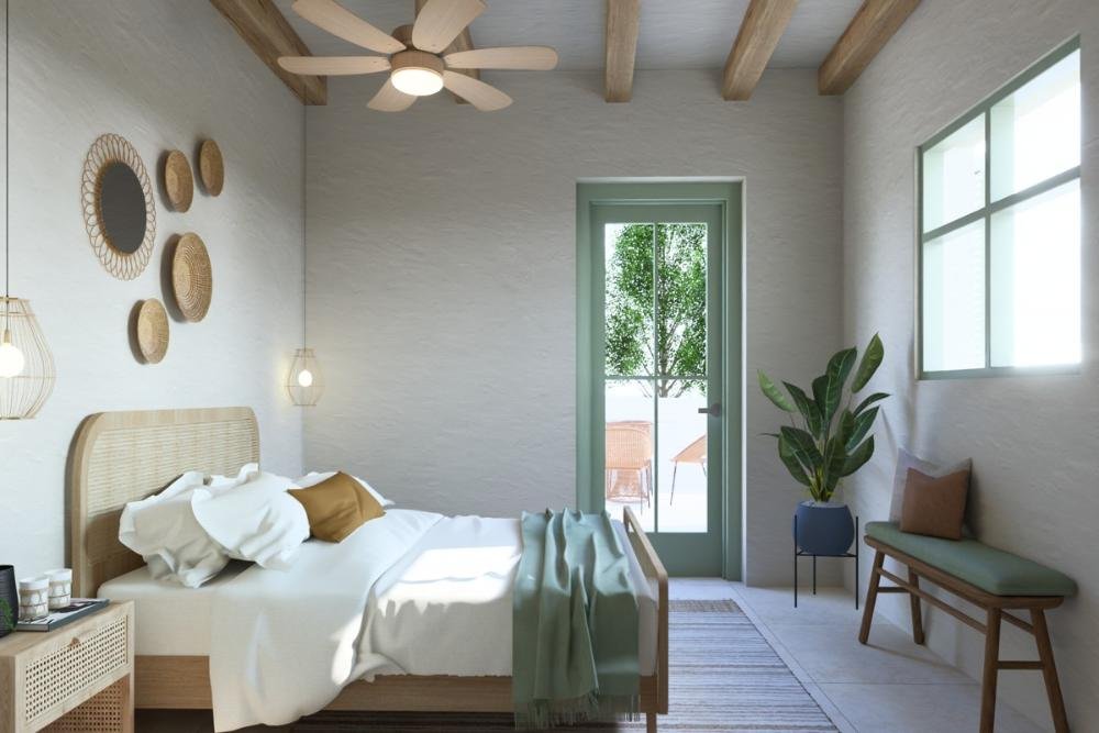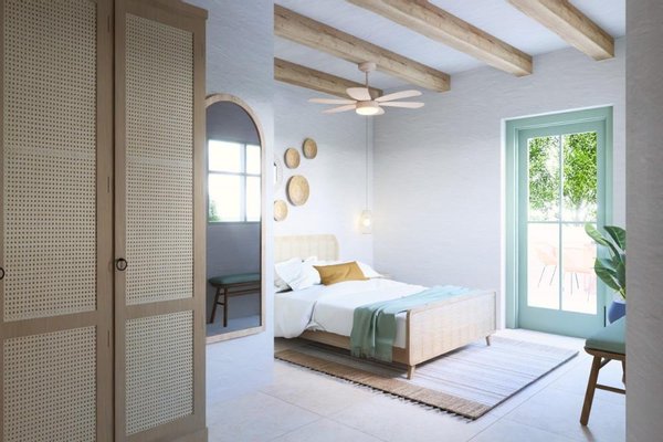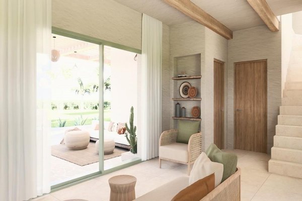 Das Erdgeschoss bietet einen offenen Wohn-, Ess- und Küchenbereich mit großen Türen, die sich zum Garten und Poolbereich öffnen. Dieser ist mit einer Außendusche, Sonnenliegen und einer Pergola für Mahlzeiten im Freien ausgestattet. Ein Doppelzimmer und ein Badezimmer vervollständigen diese Etage.