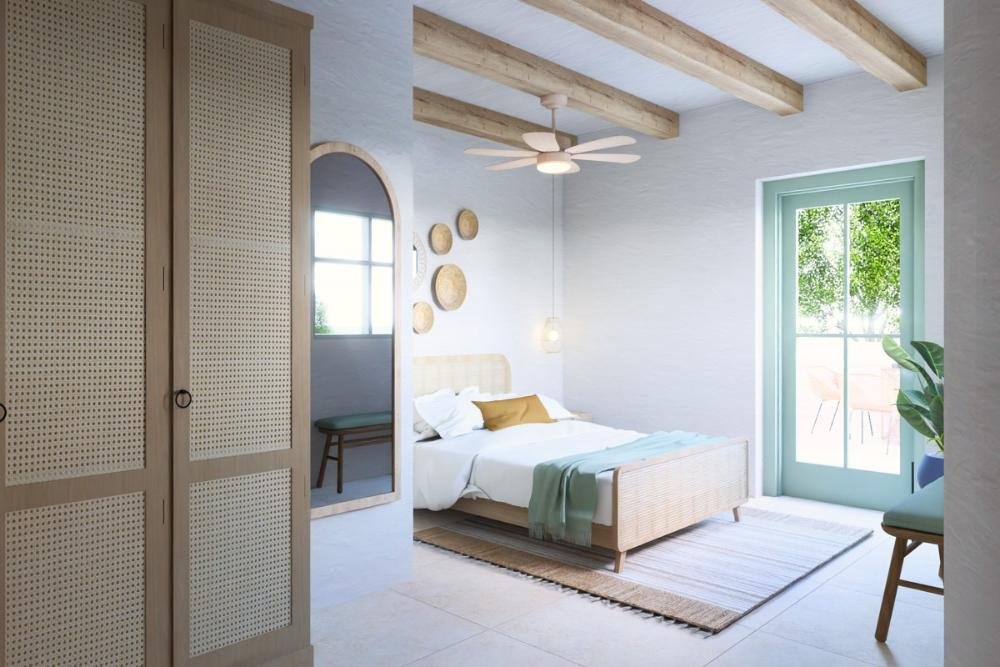 Im Obergeschoss befindet sich das Hauptschlafzimmer mit einer privaten Terrasse und Panoramablick auf die Berge und das Meer sowie einem zweiten Badezimmer.