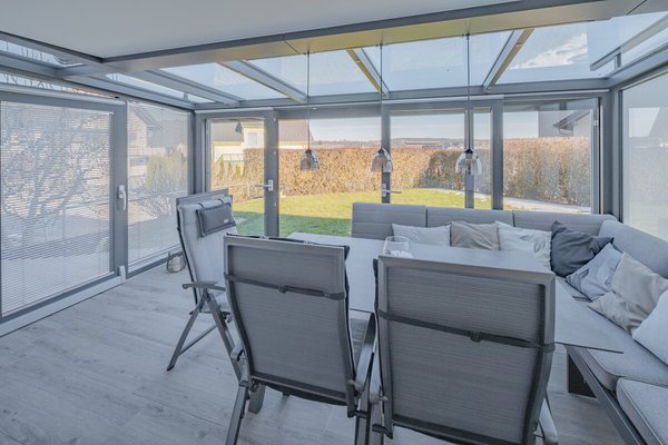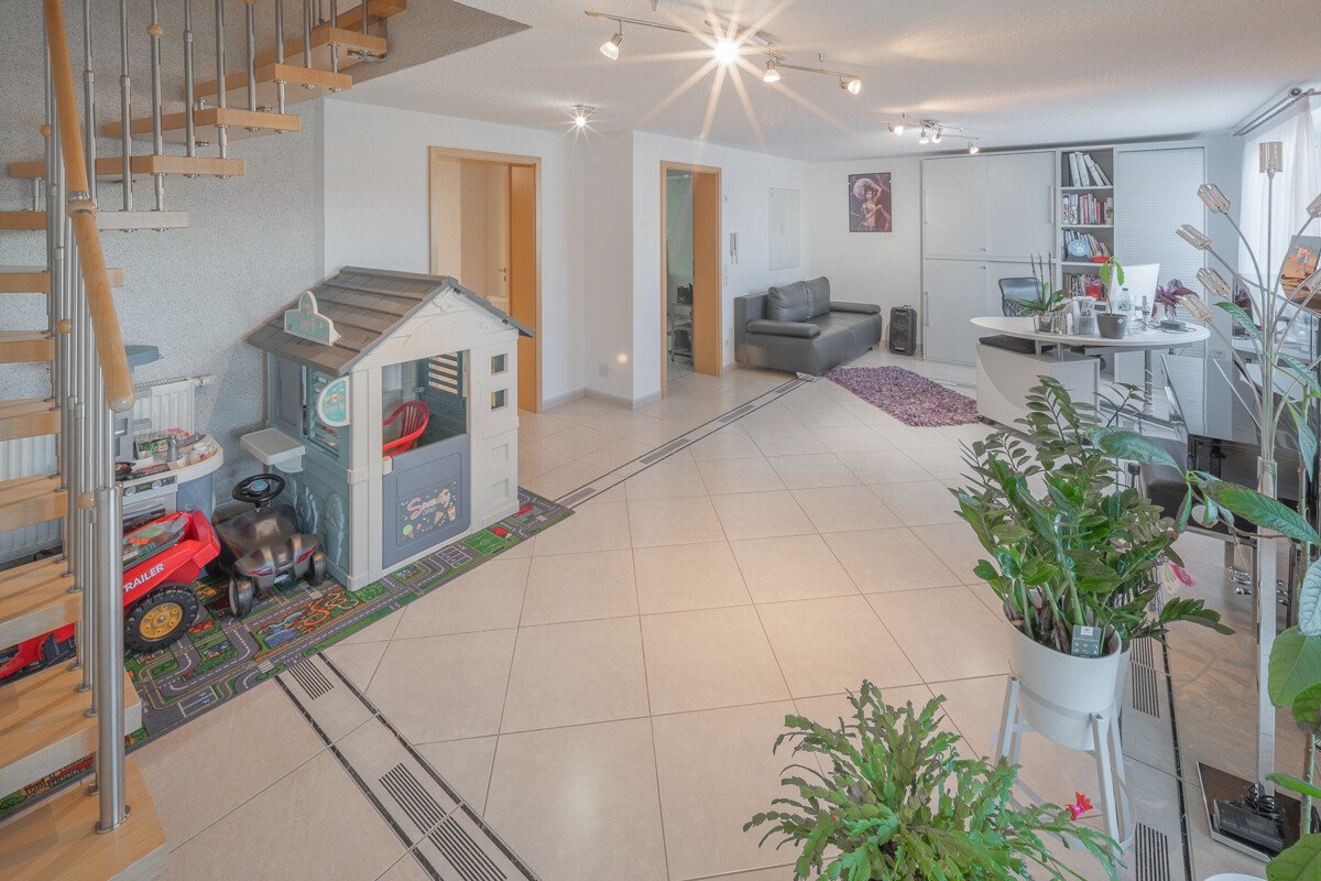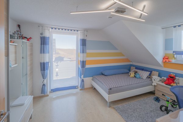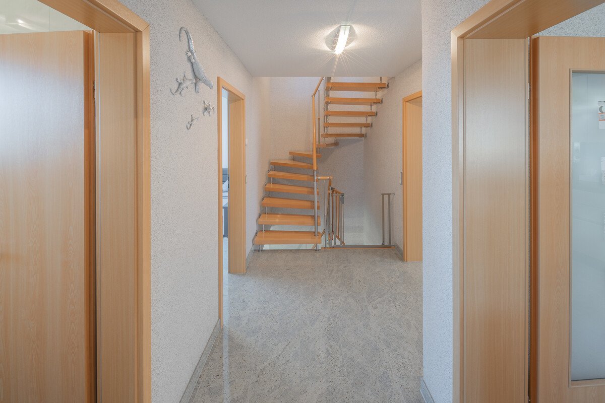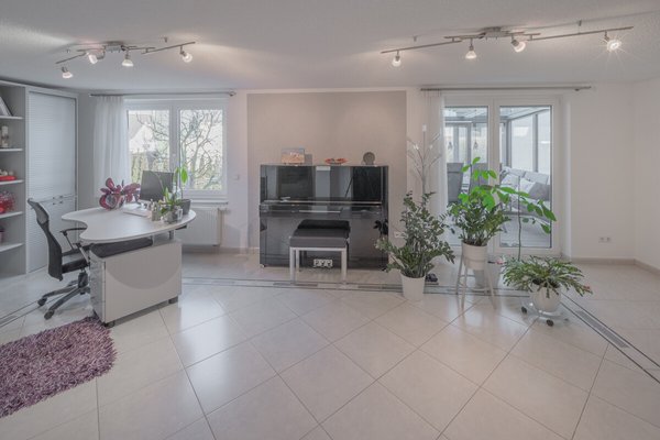Aufteilung: Im Erdgeschoß befindet sich die großzügige Küche, das Wohnzimmer mit Essdiele, sowie der nach Süden angegliederte Wintergarten. Im ersten Obergeschoß finden Sie Arbeitszimmer, bzw. Fitnessstudio, Ankleide-, bzw. Hauswirtschaftsraum, mit Einbauschränken. Das Dachgeschoß bildet mit einem Schlafzimmer und zwei Kinderzimmern die Schlafetage.