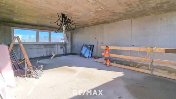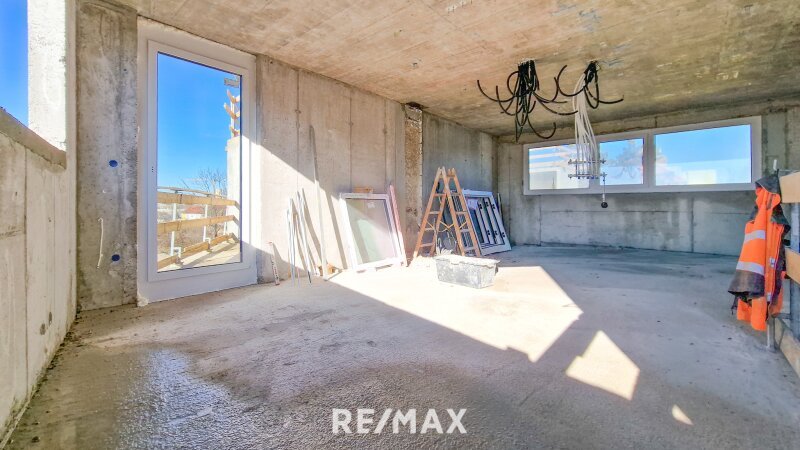 1. OG: Ca. 46,00 m² große Wohnküche mit Zugang zu Balkon/Terrasse (ca. 10,86 m²) und Abstellraum, Treppe ins Obergeschoss.