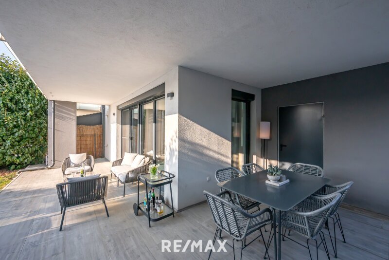 Die Terrasse ist klar zoniert: Ein Lounge-Bereich lädt zum Entspannen ein, während ein separater Essbereich im Freien ideale Voraussetzungen für Outdoor-Kulinarik, Grillabende und gemütliche Stunden mit Familie und Freunden bietet – mit Blick ins Grüne und auf den See.