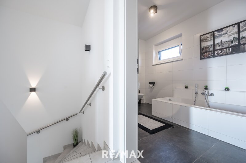 Ein besonderes Highlight ist der Wohnkeller, der weit mehr bietet als klassische Nutzfläche. Hier findet sich ausreichend Platz für einen großzügigen Family-Room im amerikanischen Stil – ideal zum Fernsehen, Entspannen und Chillen. Zusätzlich stehen Flächen für einen ausgestatteten Schrankraum, Sauna, Fitnessgeräte oder ein ruhiges Homeoffice zur Verfügung. Selbstverständlich sind auch funktionale Bereiche wie Lager- und Abstellräume, Technikraum sowie Platz für Waschmaschine und Trockner sinnvoll integriert.