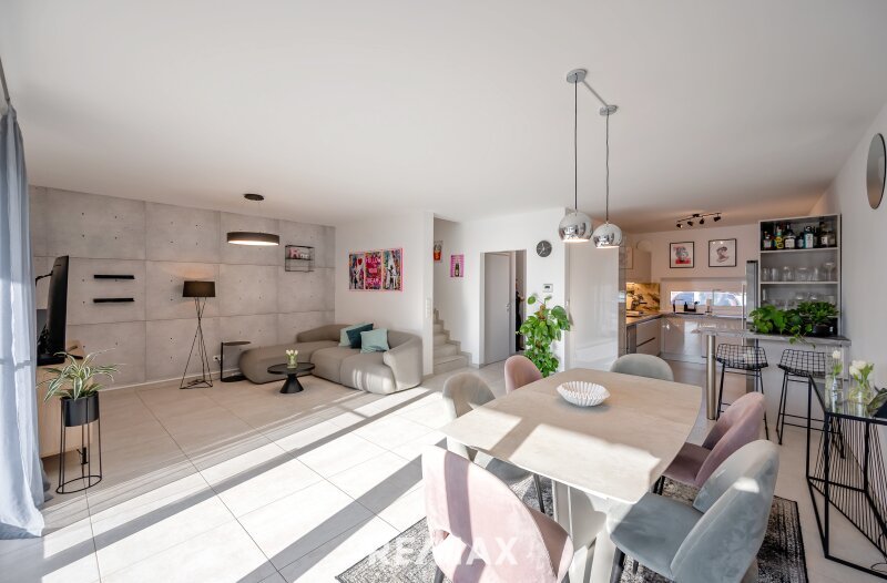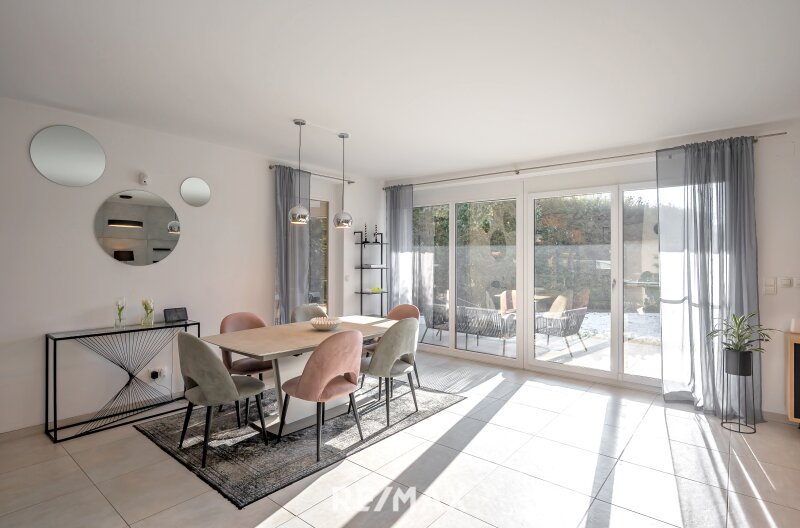 Im Erdgeschoss bildet der offen gestaltete Wohn-Ess-Bereich das Herz des Hauses. Große Terrassenschiebetüren öffnen den Raum zur Terrasse, in den Garten und zum See und schaffen eine fließende Verbindung zwischen Innen- und Außenbereich. Hier ist Platz für gemeinsames Leben – für Mahlzeiten mit den Lieben, Gespräche und entspannte Stunden im Familienalltag.