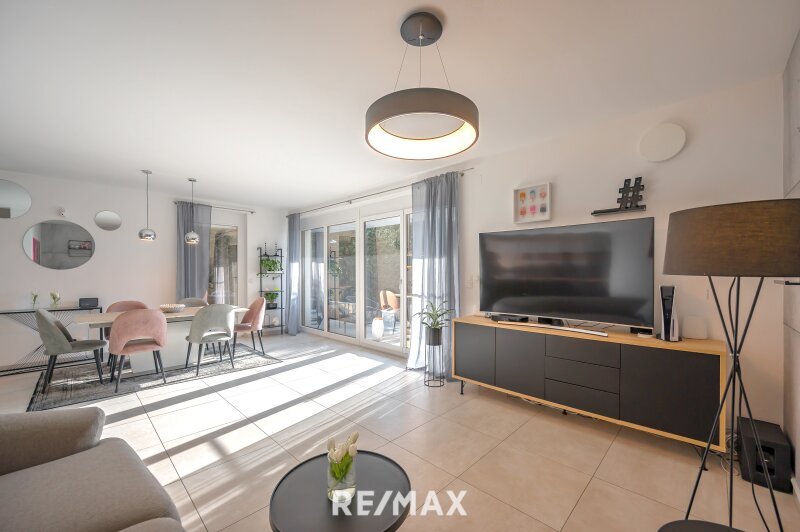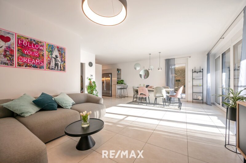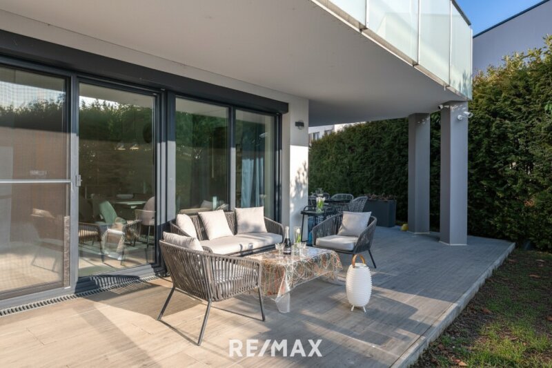 Die Terrasse ist klar zoniert: Ein Lounge-Bereich lädt zum Entspannen ein, während ein separater Essbereich im Freien ideale Voraussetzungen für Outdoor-Kulinarik, Grillabende und gemütliche Stunden mit Familie und Freunden bietet – mit Blick ins Grüne und auf den See.