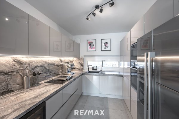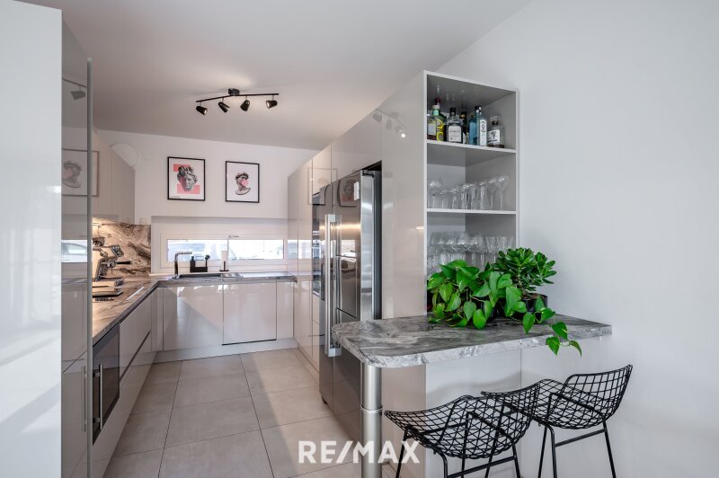Die offen angebundene Einbauküche ist mit hochwertigen Geräten, teilweise in Edelstahl, ausgestattet und fügt sich elegant in den Wohnbereich ein. Ein kleiner Barbereich bietet Platz für den ersten Kaffee am Morgen oder ein schnelles Frühstück zwischendurch – praktisch, kommunikativ und stilvoll zugleich.