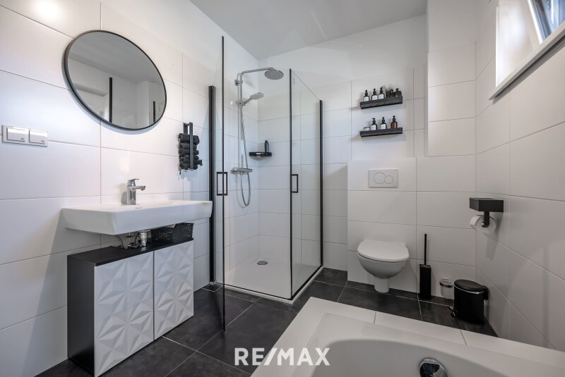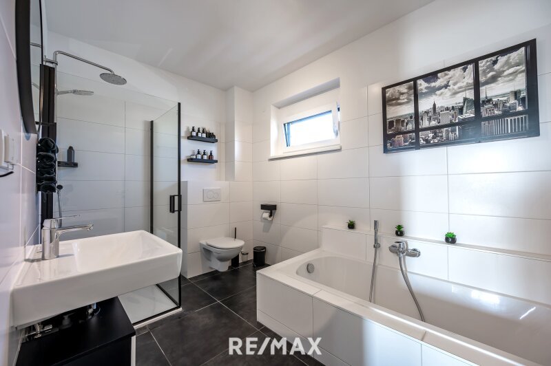 Das stilvolle Bad überzeugt mit Walk-in-Dusche, Badewanne und Doppelwaschbecken und ist funktional wie ästhetisch auf die Bedürfnisse einer Familie abgestimmt.