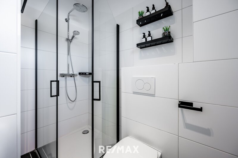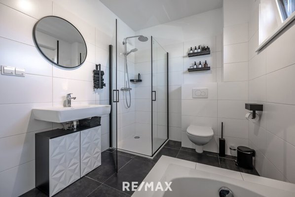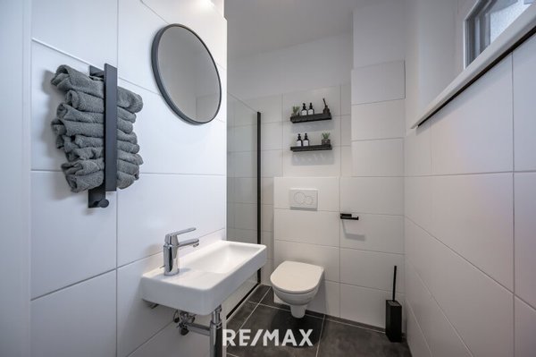 Bereits im Eingangsbereich des Hauses steht ein Gäste-WC mit zusätzlicher Dusche zur Verfügung – ein durchdachtes Detail für Alltag und Besuch.