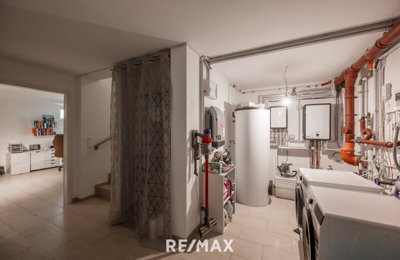 Ein besonderes Highlight ist der Wohnkeller, der weit mehr bietet als klassische Nutzfläche. Hier findet sich ausreichend Platz für einen großzügigen Family-Room im amerikanischen Stil – ideal zum Fernsehen, Entspannen und Chillen. Zusätzlich stehen Flächen für einen ausgestatteten Schrankraum, Sauna, Fitnessgeräte oder ein ruhiges Homeoffice zur Verfügung. Selbstverständlich sind auch funktionale Bereiche wie Lager- und Abstellräume, Technikraum sowie Platz für Waschmaschine und Trockner sinnvoll integriert.