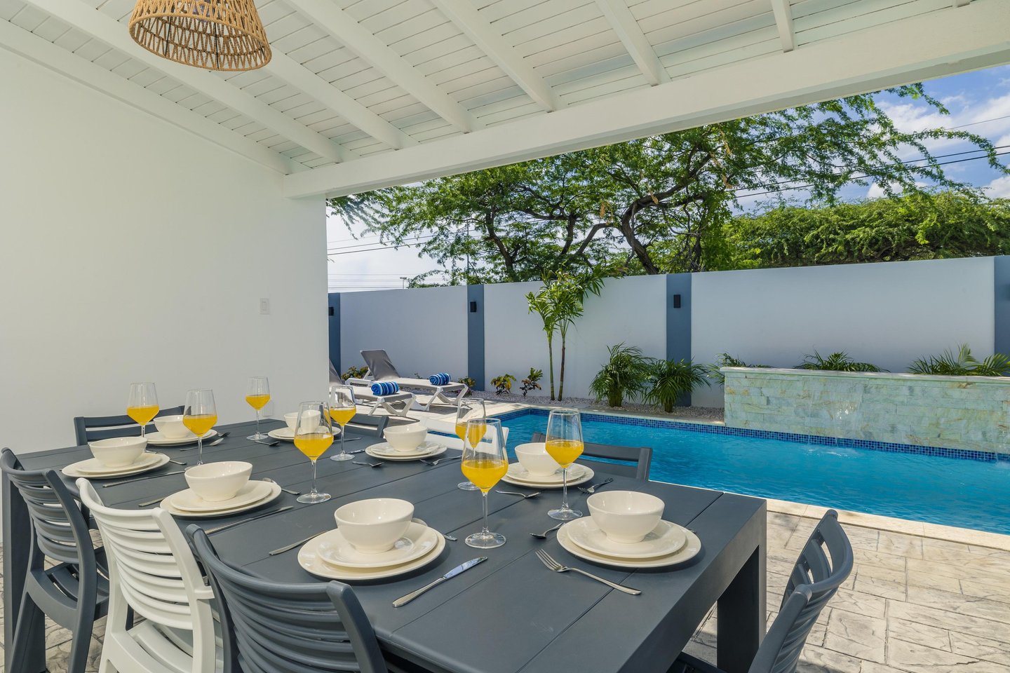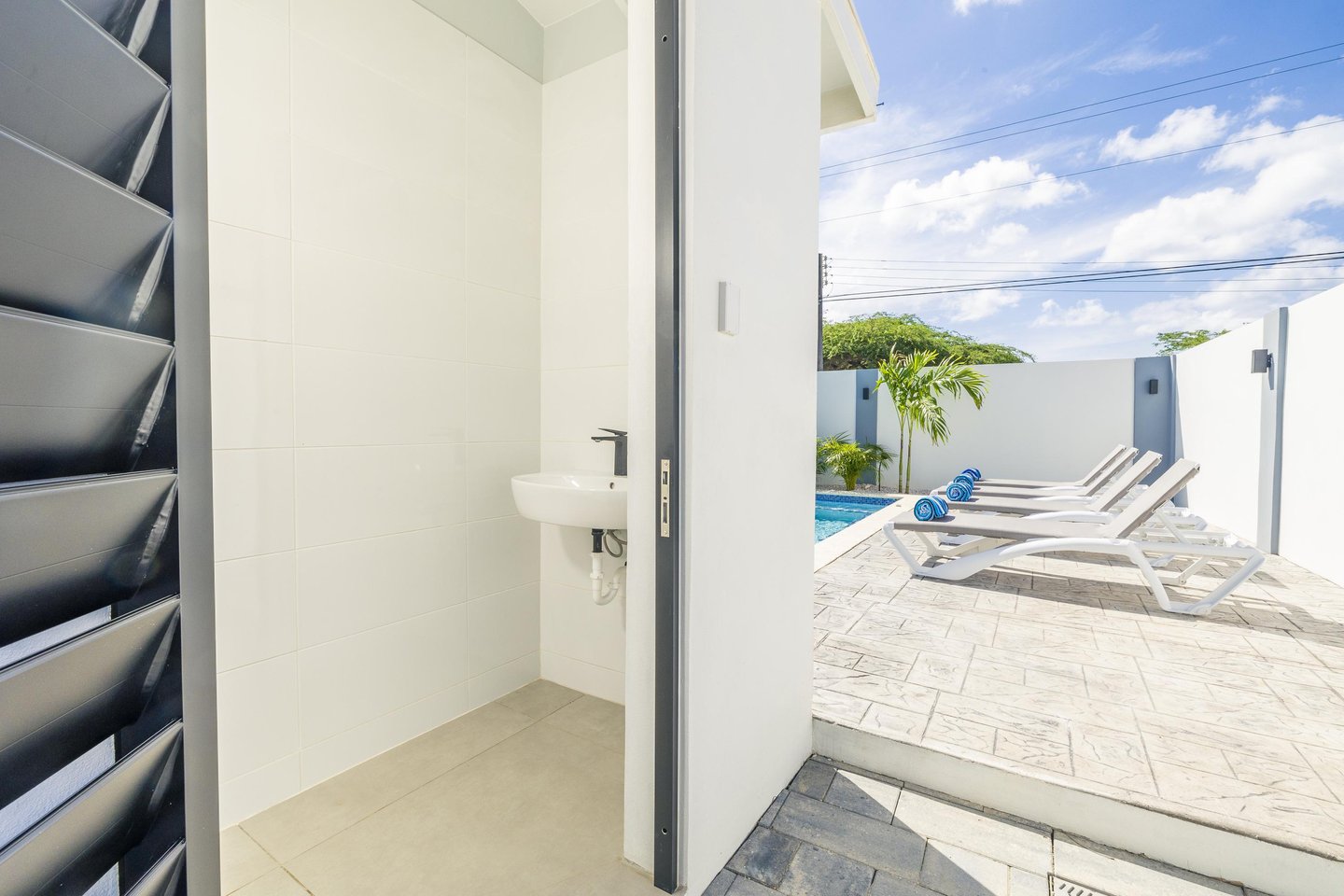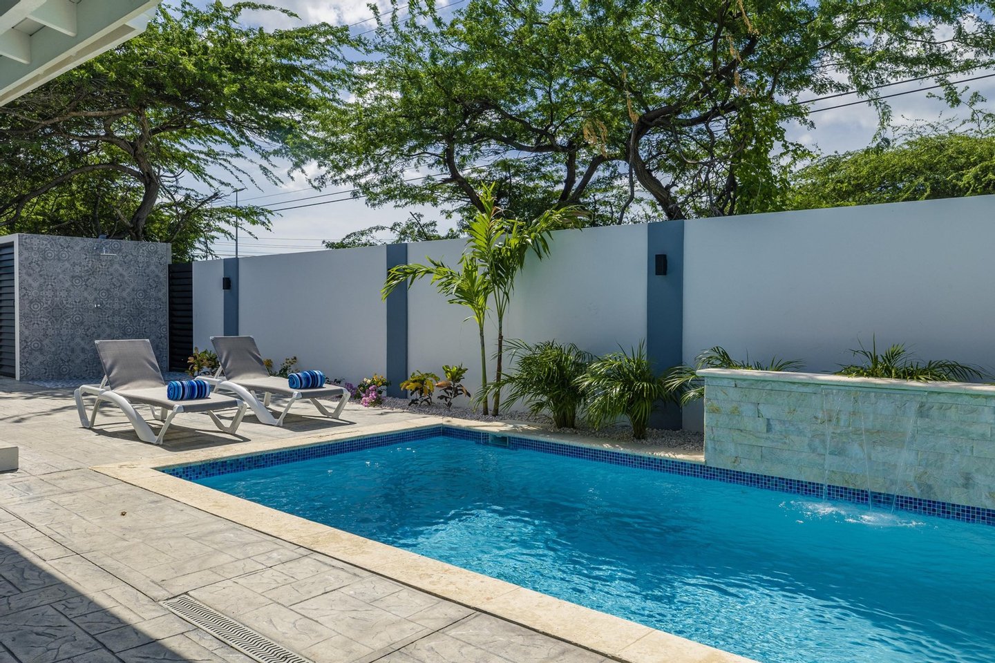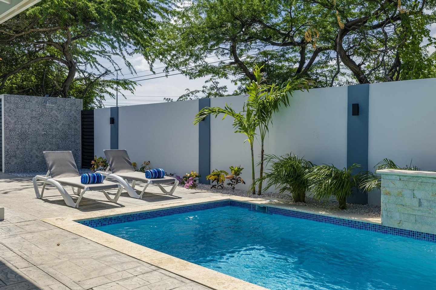 Glitzernder Poolbereich zum EntspannenAußendusche