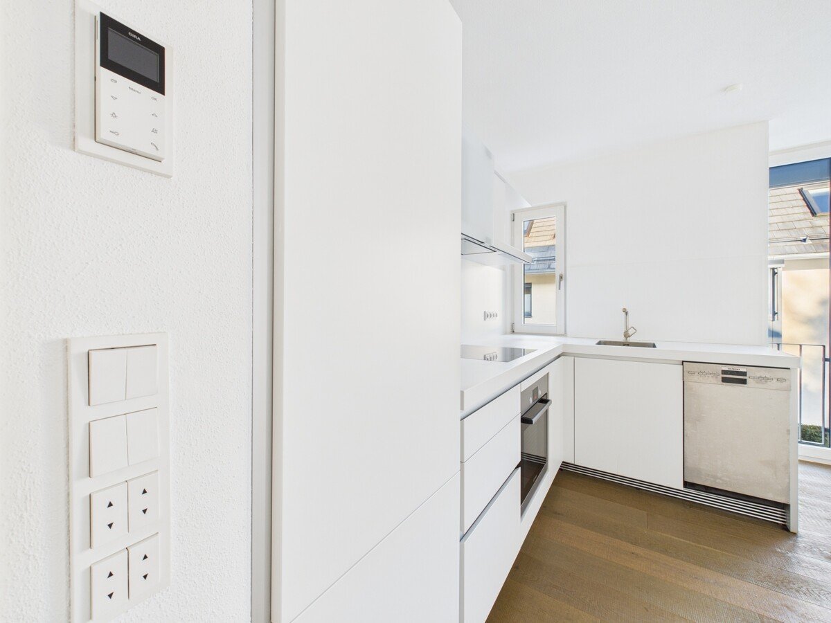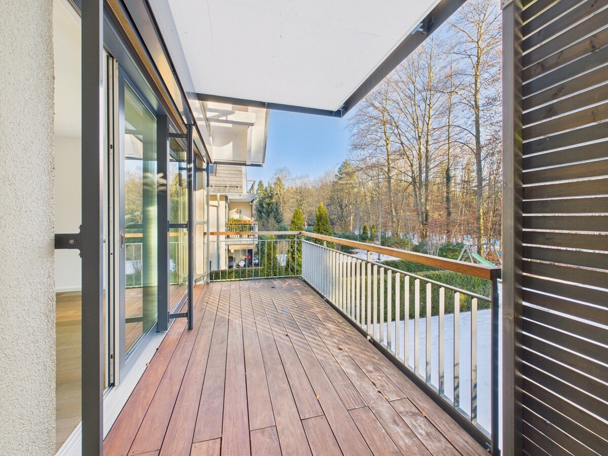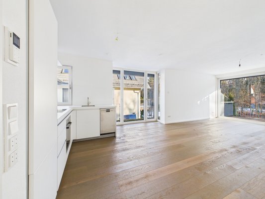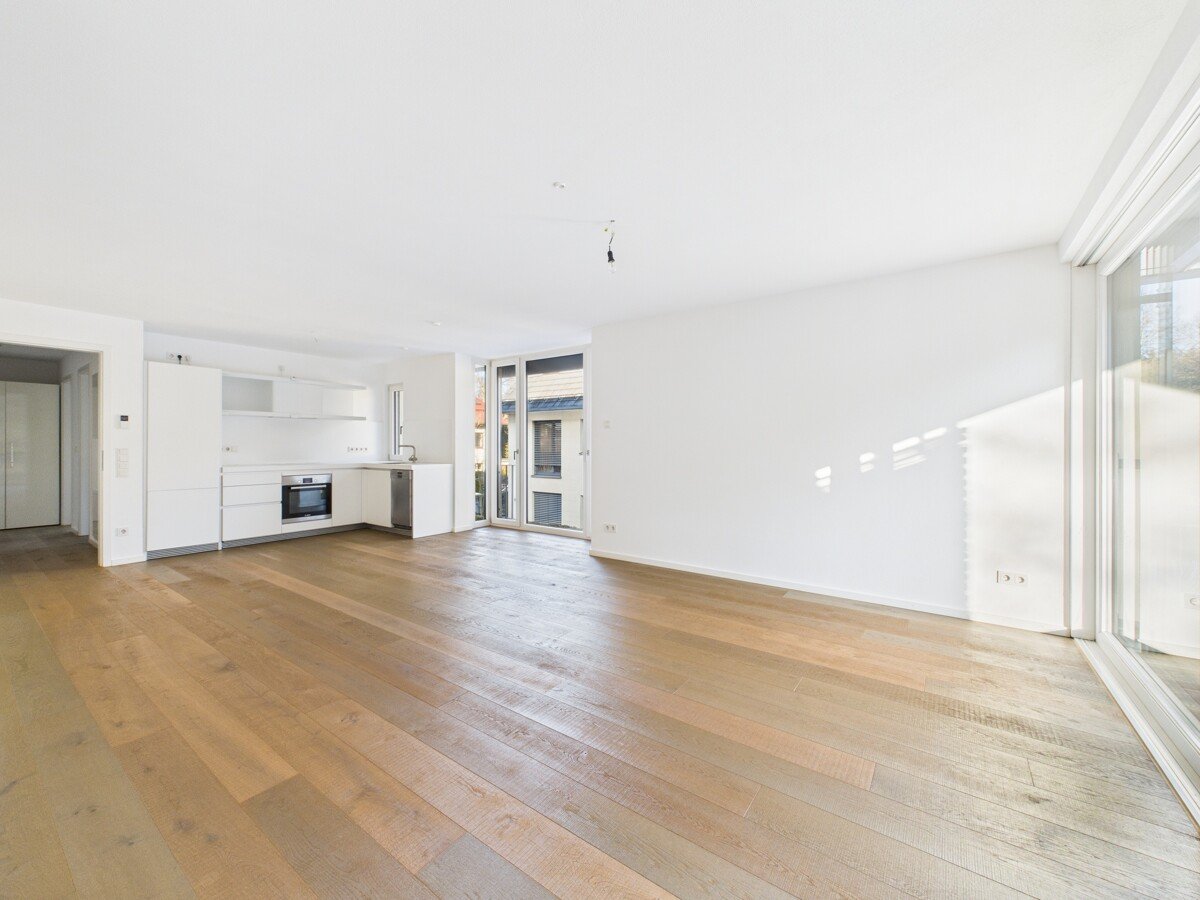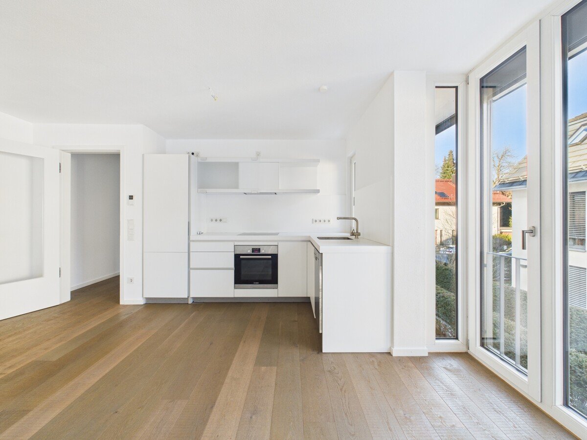 Der Wohn- und Essbereich präsentiert sich hell und einladend und wird durch die Ausrichtung zum Grünen zu einer echten Wohnfühloase. Von hier aus gelangen Sie auf den sonnigen Südbalkon – ein perfekter Rückzugsort für entspannte Stunden mit Blick ins Idyll. Die vorhandene, hochwertige Bulthaup Küche inklusive Geräten fügt sich harmonisch in das Wohnkonzept ein und erfüllt höchste Ansprüche an Design und Funktionalität.