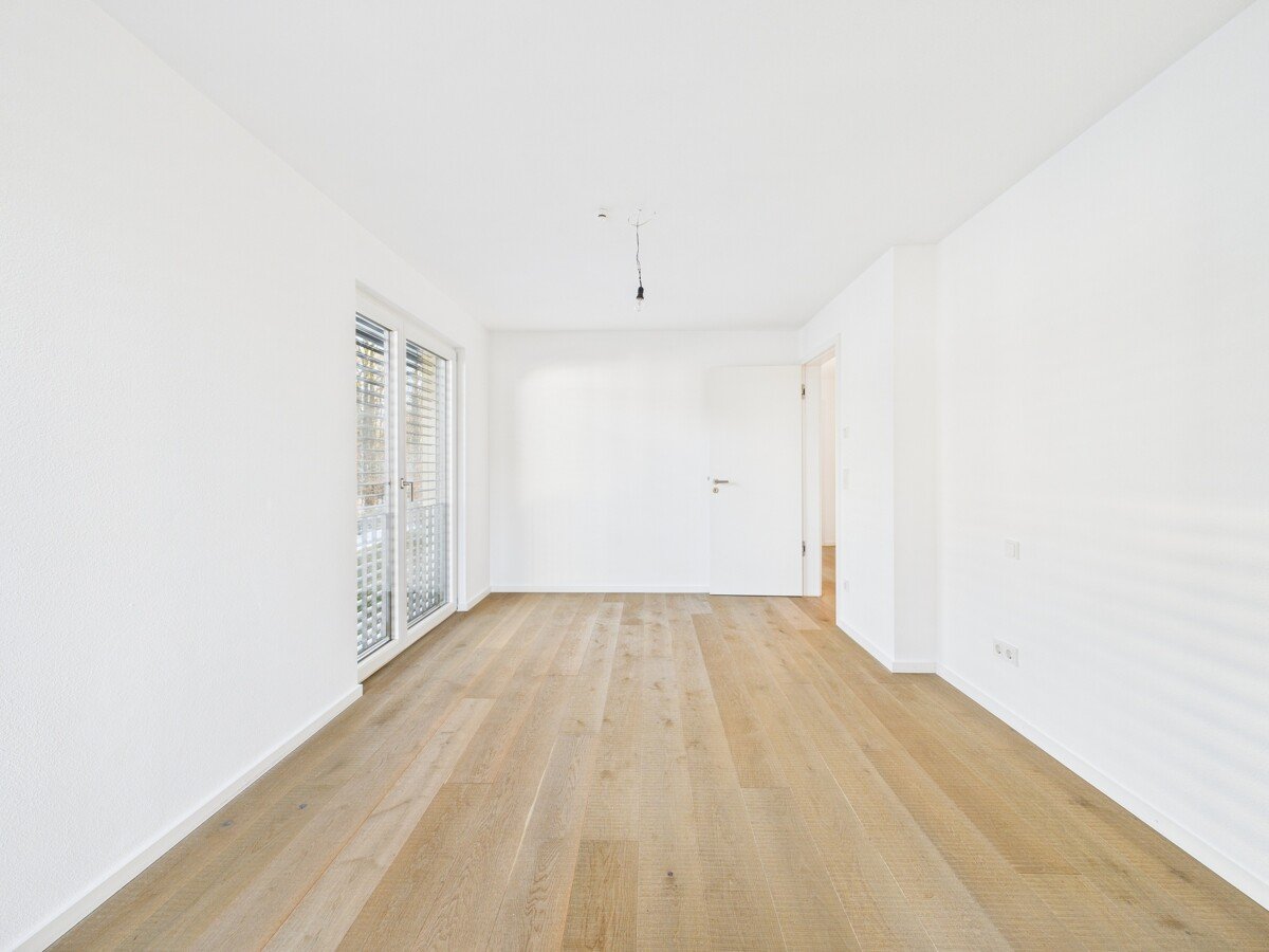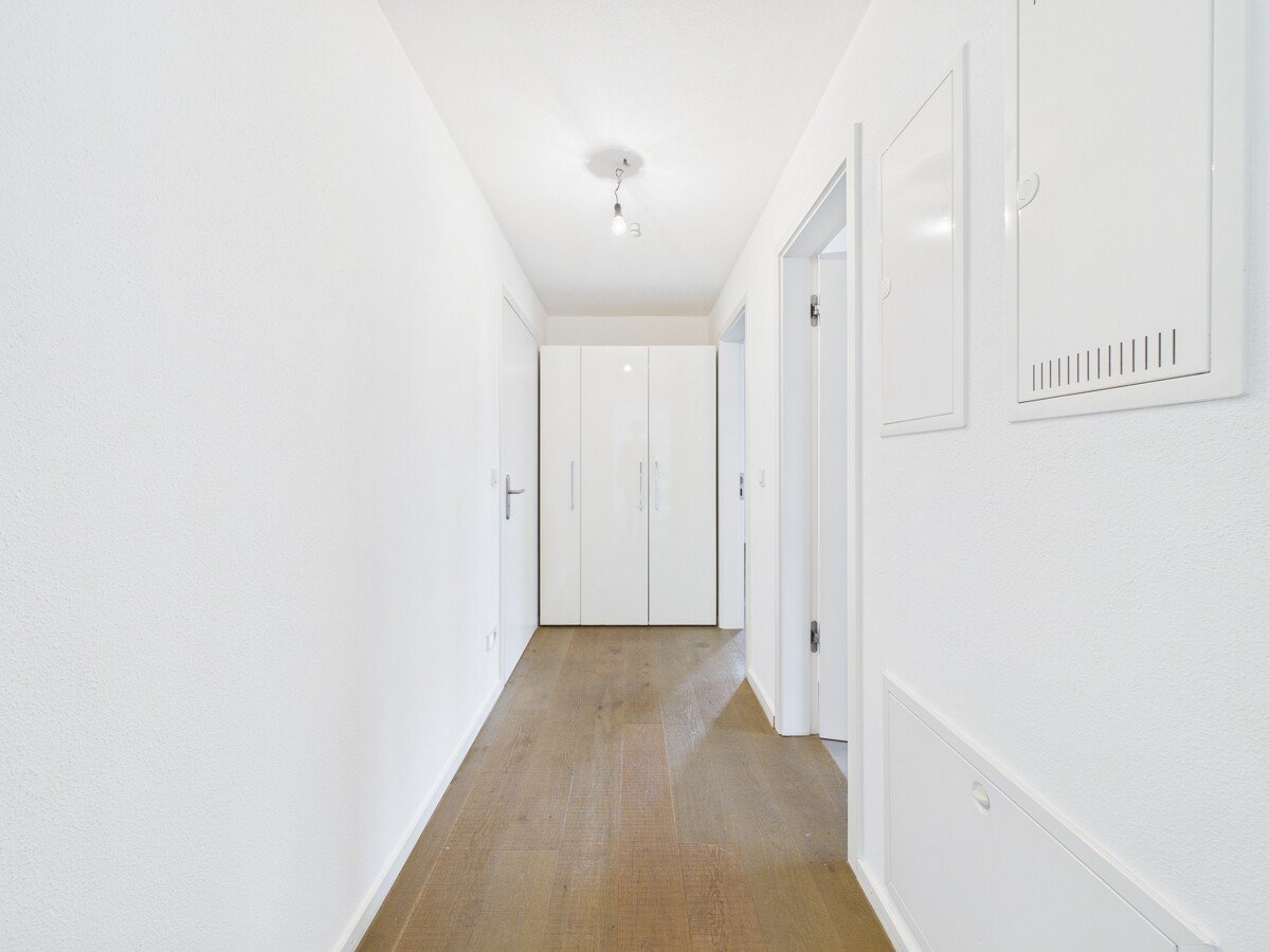 Das Schlafzimmer bietet angenehme Ruhe und ausreichend Platz für eine komfortable Möblierung. Das großzügige Badezimmer überzeugt mit bodengleicher Dusche und Badewanne sowie einer attraktiven Ausstattung; ein zusätzlicher Handtuchheizkörper ergänzt den Komfort. Edler Eiche-Parkettboden und Feinsteinzeugfliesen unterstreichen den stilvollen Charakter der Wohnung.