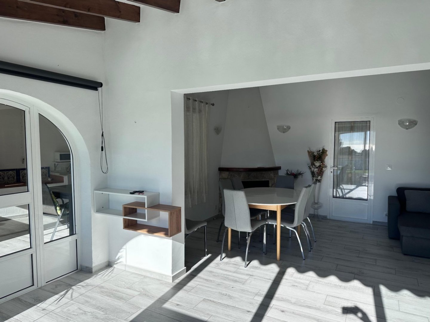 Die Villa hat eine bebaute Fläche von ca. 180 m² und ist komplett ebenerdig. Das Wohn-Esszimmer mit Kamin ist hell und schließt direkt an die überdachte Veranda und die Poolterrasse an. Die separate Küche ist funktional und verfügt über ausreichend Stauraum. Das Haus verfügt über drei Schlafzimmer, ein Badezimmer mit Dusche und ein separates Gäste-WC. Außerdem gibt es einen Waschraum.