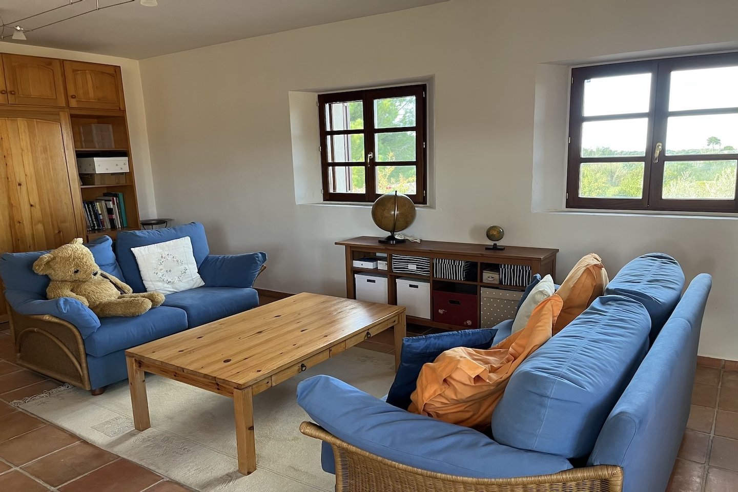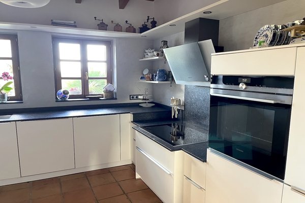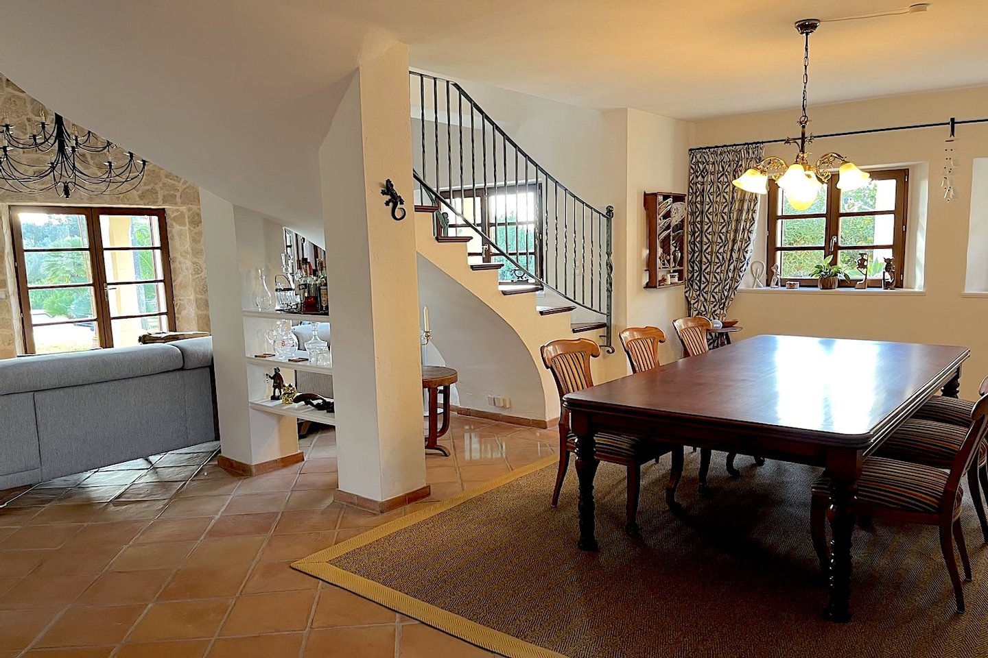 Schon von außen begeistert die Finca mit ihrer authentischen Natursteinfassade. Im Erdgeschoss erwartet Sie ein einladender Wohn- und Essbereich mit Ofen. Eine Natursteinwand im Wohnzimmer sowie hohe Decken mit Holzbalken schaffen ein behagliches und stilvolles Ambiente. Eine Treppe im Wohnzimmer führt zu einem vielseitig nutzbaren Raum, der derzeit als Büro dient. Die moderne Küche ist komplett ausgestattet und verfügt über einen praktischen Hauswirtschaftsraum mit Zugang zum Keller, der ideal für die Einrichtung einer Bodega genutzt werden kann.