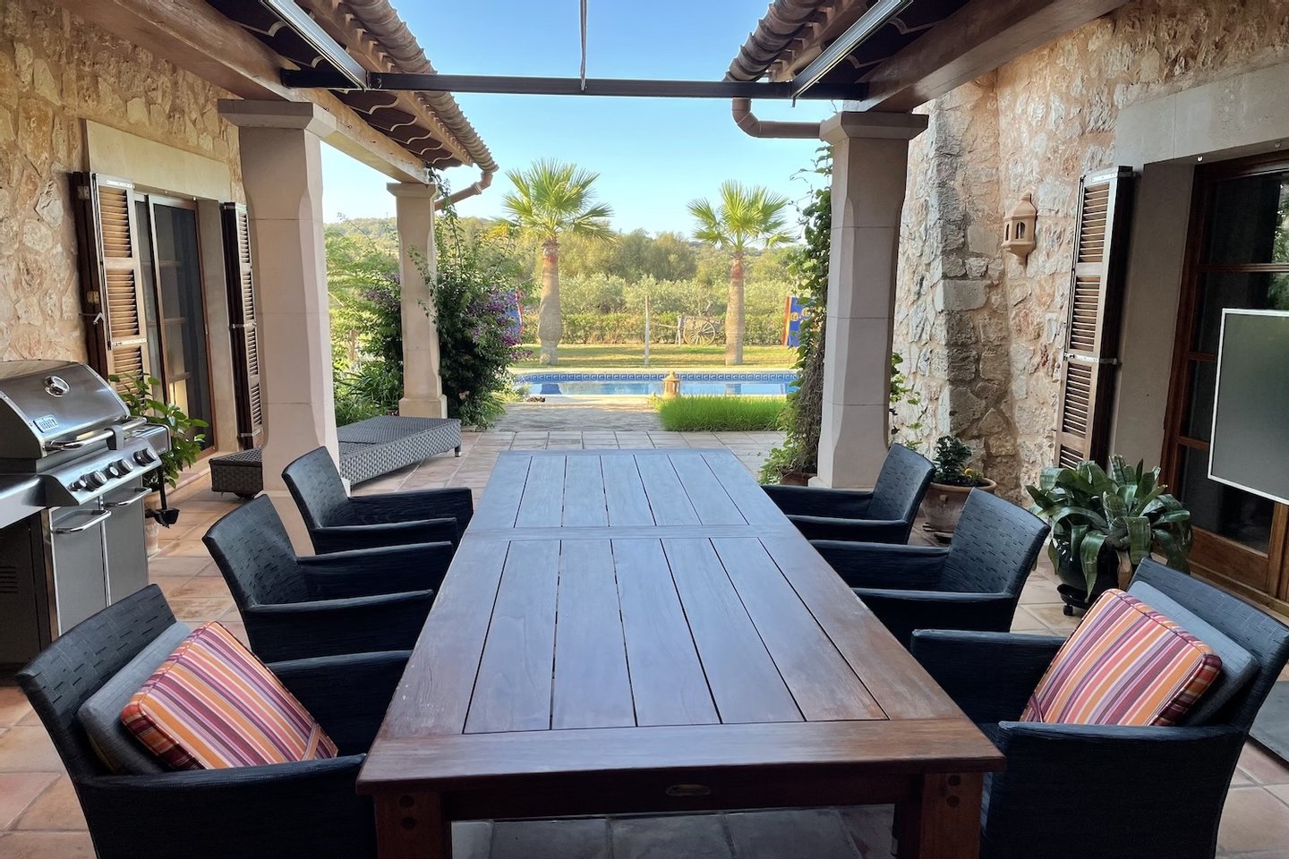 Der Außenbereich ist liebevoll mediterran gestaltet. Eine überdachte Terrasse in U-Form lädt mit einladenden Sitzmöglichkeiten zum Verweilen ein. Der ca. 12 x 5 m große, beheizbare Pool mit Abdeckung sorgt für zusätzlichen Komfort und Entspannung.