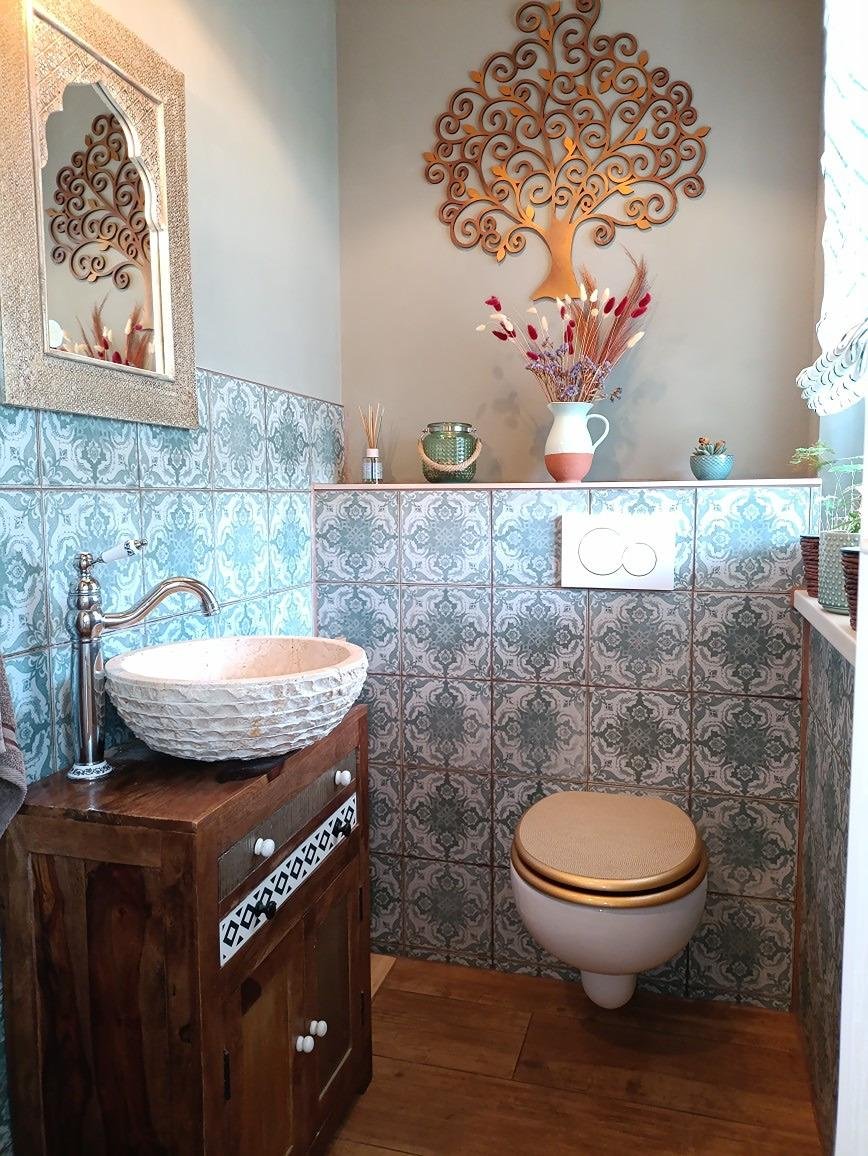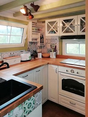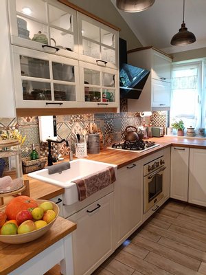 voll ausgestattete Landhausküche, Bad mit Flusssteinfliesen und ebenerdiger