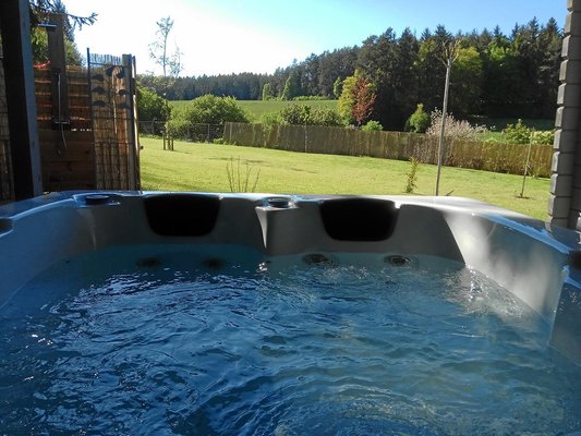 -überdachten Jacuzzi-Bereich mit Warmwasser-Außendusche
