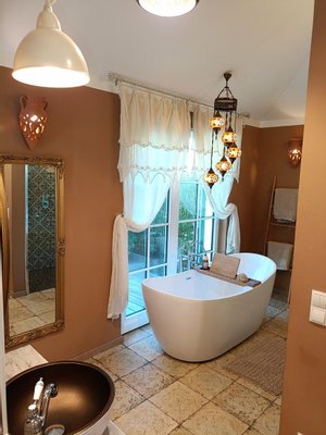 Das Schlafzimmer geht fließend in das Masterbad über – mit freistehender Wanne, Blick in den Bambusgarten, ebenerdiger Regendusche mit Echtglaswand und orientalischem Mosaik.