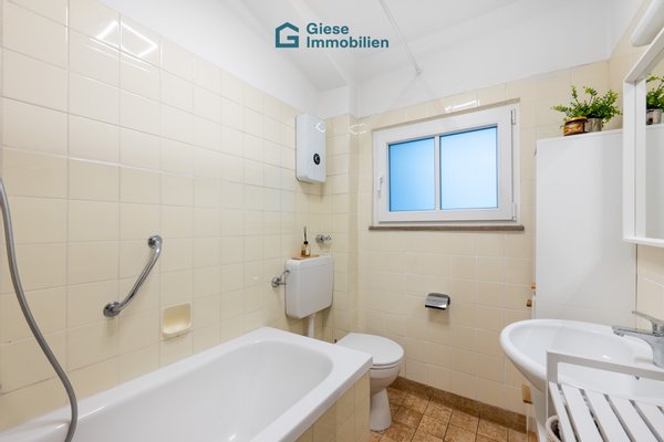 Das Tageslichtbad ist mit einer Badewanne ausgestattet und verfügt über einen neuen Durchlauferhitzer, was zeitgemäßen Komfort garantiert. Das Fenster sorgt für eine helle, angenehme Atmosphäre.