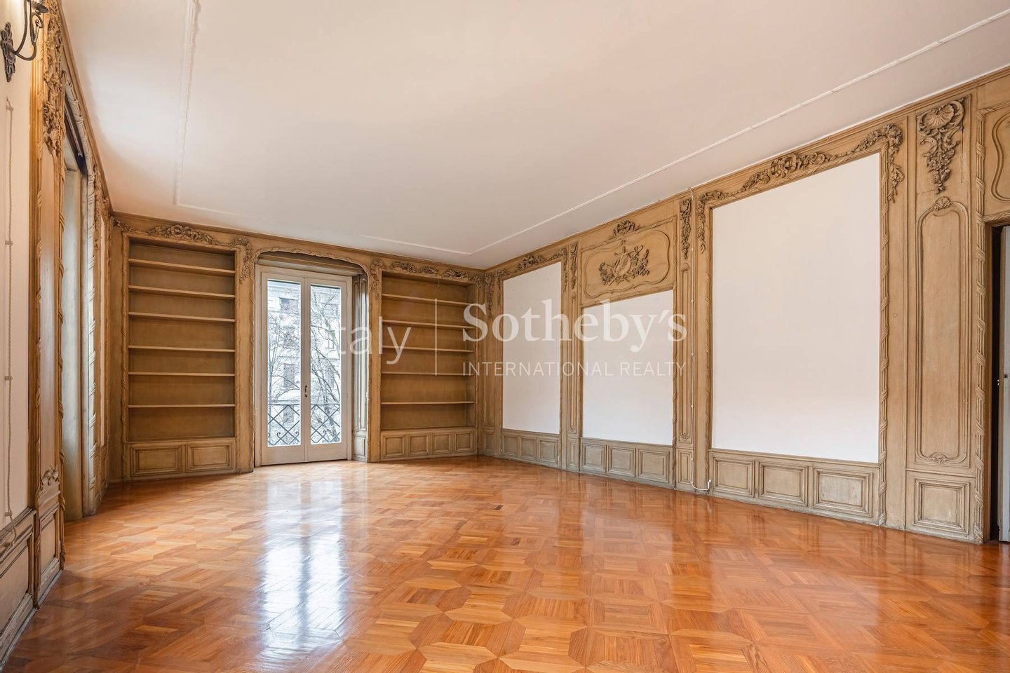 Beim Betreten empfängt ein großzügiger Eingangsbereich, der in einen repräsentativen Salon mit Balkon und Blick in den Garten übergeht und eine Atmosphäre von Ruhe und Schönheit schafft. Neben dem Haupteingang verfügt die Wohnung über zwei weitere Zugänge, die zusätzlichen Komfort bieten. Der Wohnbereich umfasst ein großes, doppelt belichtetes Wohnzimmer mit originaler Boiserie. Das Esszimmer beeindruckt mit seinem ovalen Grundriss und einem bezaubernden Fresko. Ergänzt wird dieser Bereich durch eine Servicezone sowie eine geräumige Wohnküche.