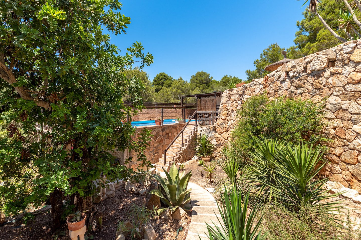 Der liebevoll angelegte Außenbereich grenzt an eine Grünzone und bietet eine private, naturnahe Oase. Dank Westausrichtung genießt man hier ganztägig Sonne. Ein großzügiger Pool mit Außendusche sorgt für Erfrischung, mehrere Sitz- und Ruhebereiche verteilen sich über das gesamte Grundstück.
