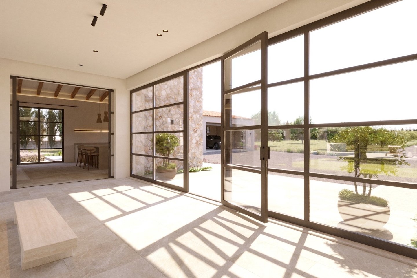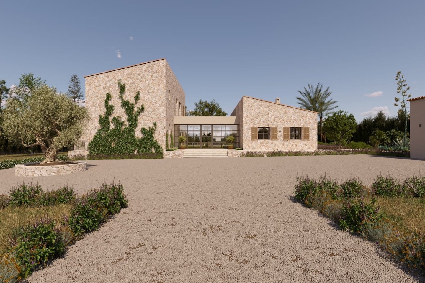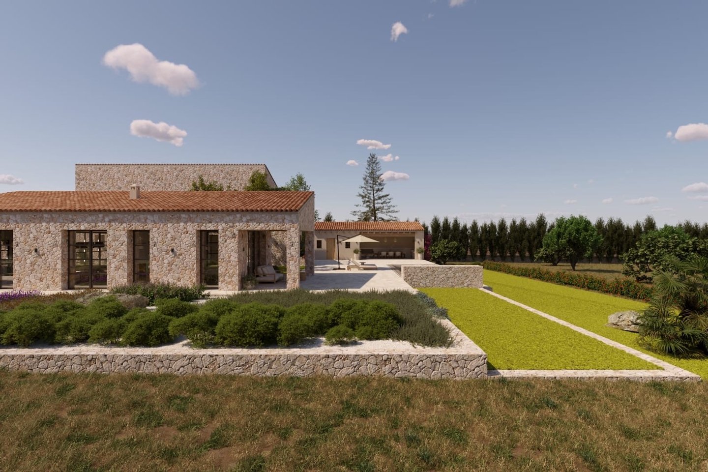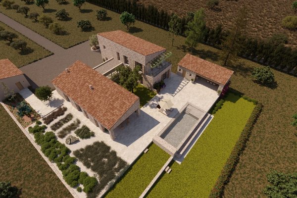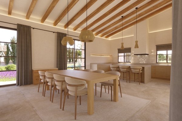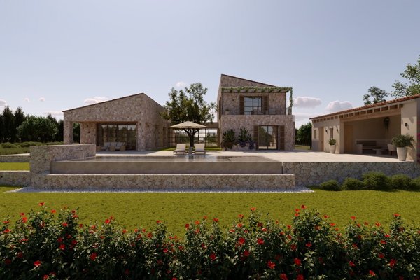 In der idyllischen Landschaft von Campos wird der Bau dieser modernen Finca, die zeitgenössische Architektur mit traditionellen mallorquinischen Elementen verbindet, geplant. Naturstein, sichtbare Holzbalken und hohe Decken schaffen Charakter und