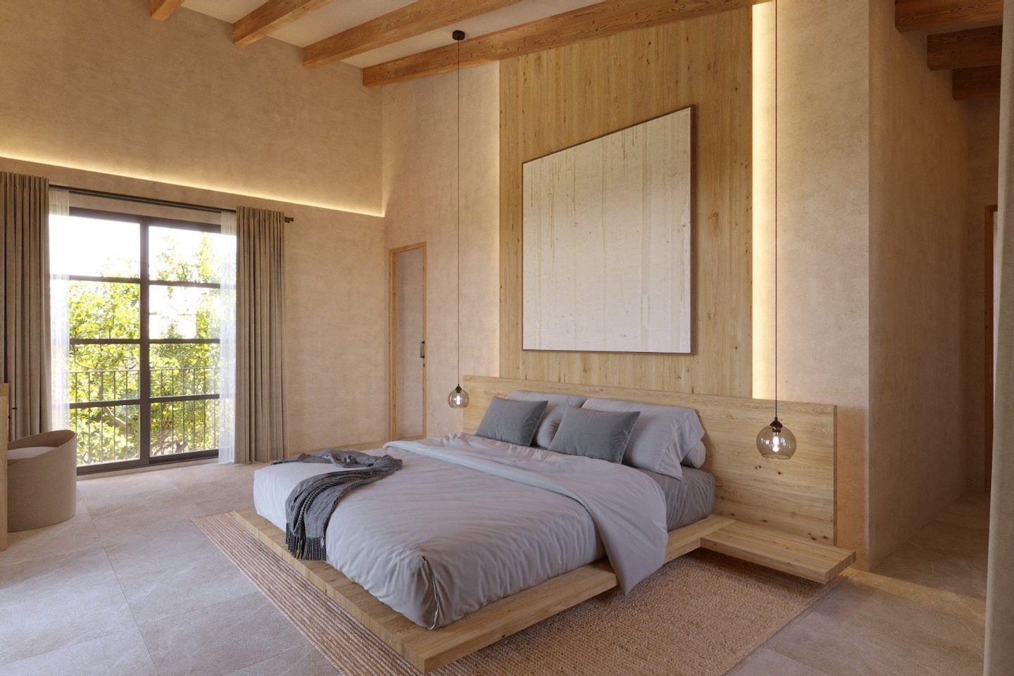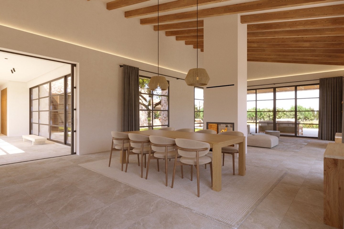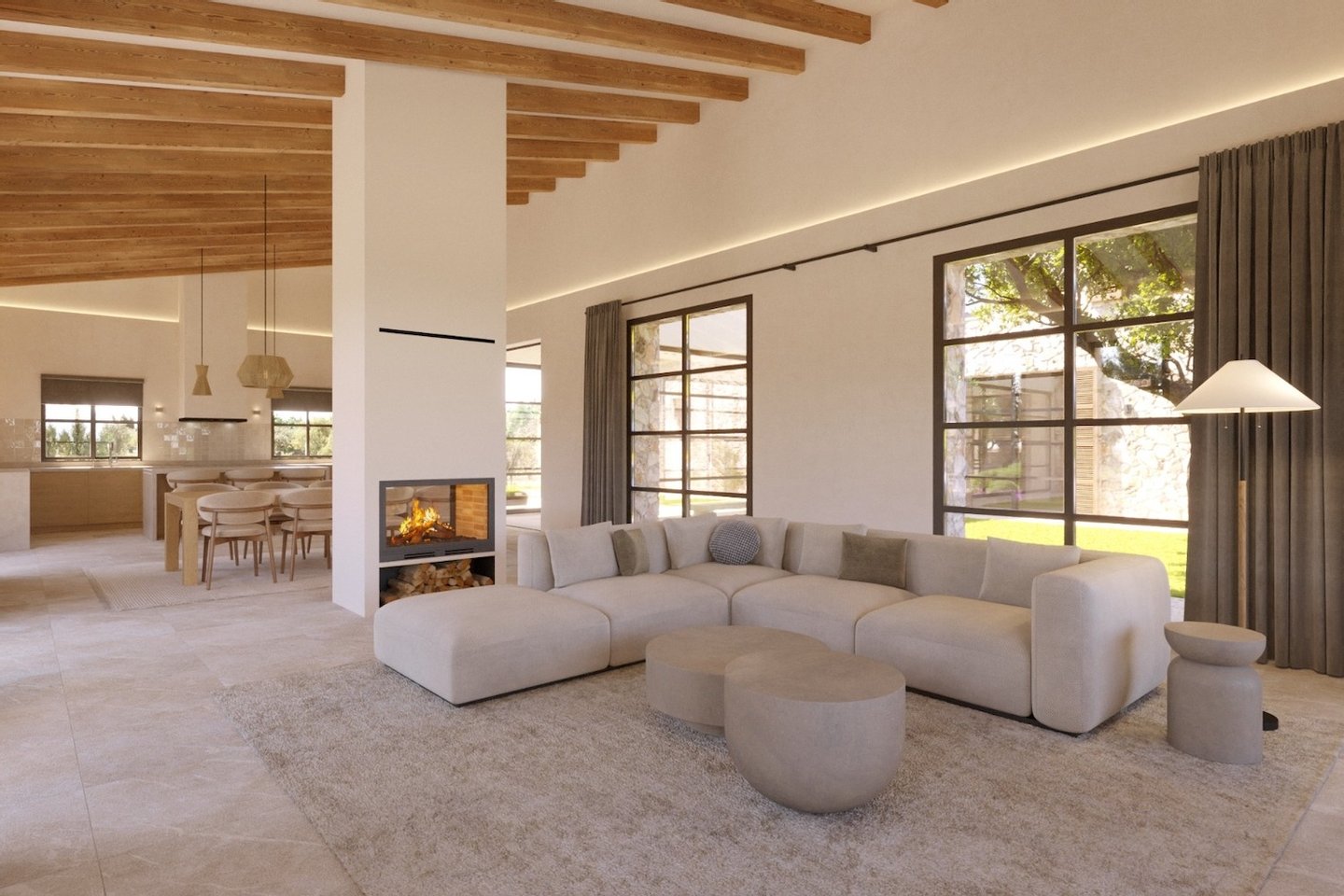 In der idyllischen Landschaft von Campos wird der Bau dieser modernen Finca, die zeitgenössische Architektur mit traditionellen mallorquinischen Elementen verbindet, geplant. Naturstein, sichtbare Holzbalken und hohe Decken schaffen Charakter und