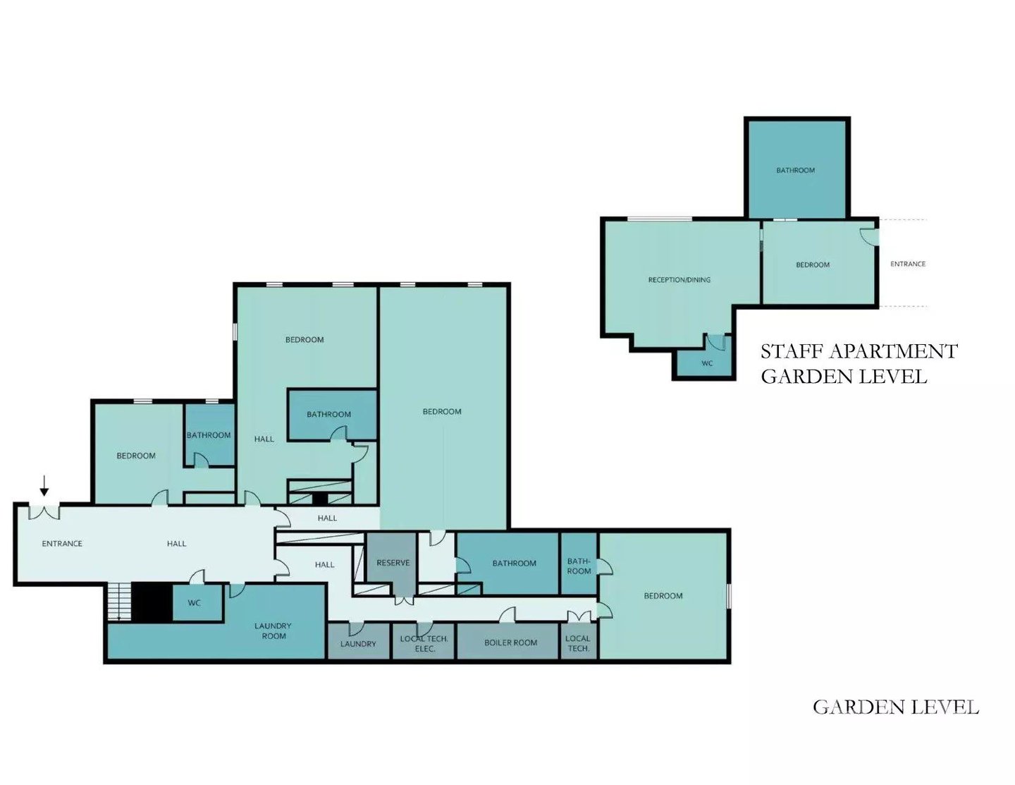 Das Anwesen verfügt über sieben Schlafzimmer, die sorgfältig angeordnet sind, um Privatsphäre und Ruhe zu gewährleisten. Auf der Gartenebene führt der Eingang zu vier Schlafzimmern mit eigenem Bad, einem Waschraum und großzügigem Stauraum.