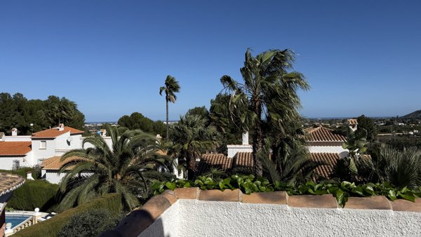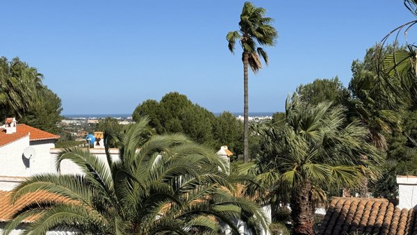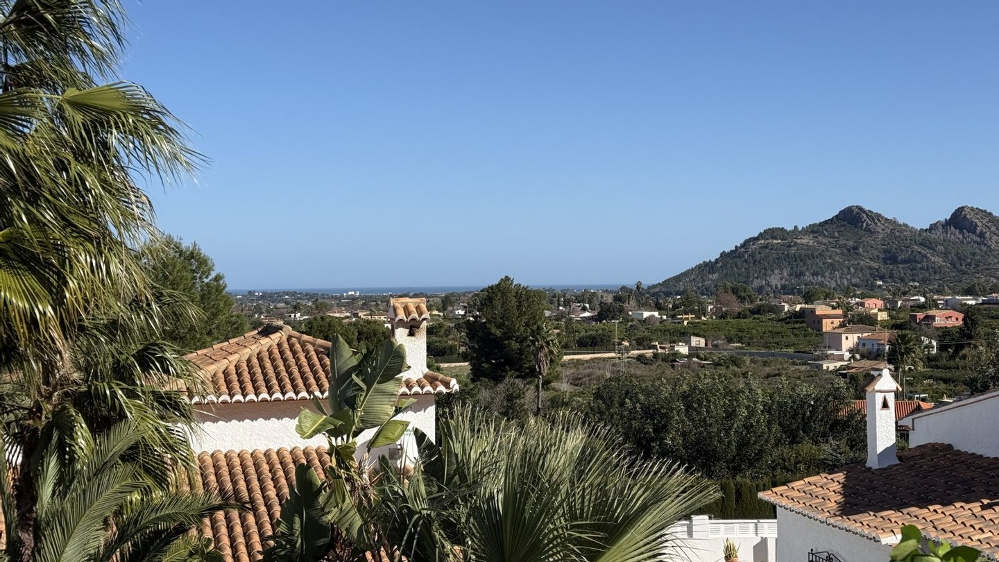 Schöne ruhige Wohnlage mit Meersicht von der oberen Dachterrasse. Die Entfernung nach Pedreguer beträgt ca. 2 KM, die Entfernung nach Denia beträgt ca. 12 KM