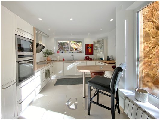 Die moderne Einbauküche mit Frühstücksbereich befindet sich angrenzend. Diese bietet Ihnen Zugang in einen gemütlichen Innenhof.
