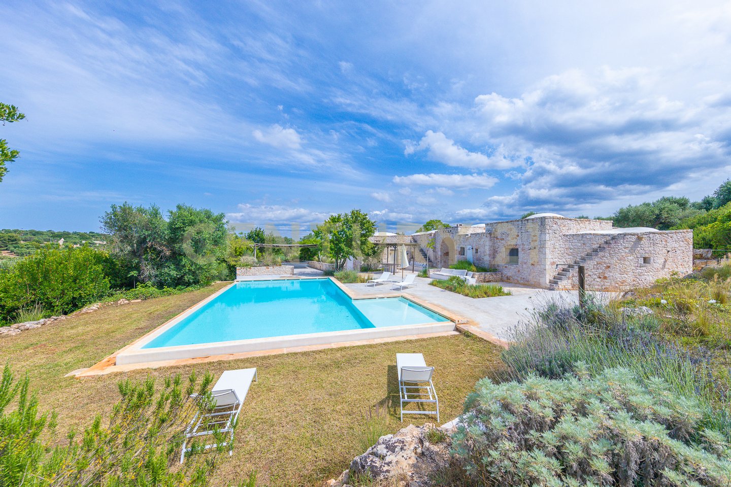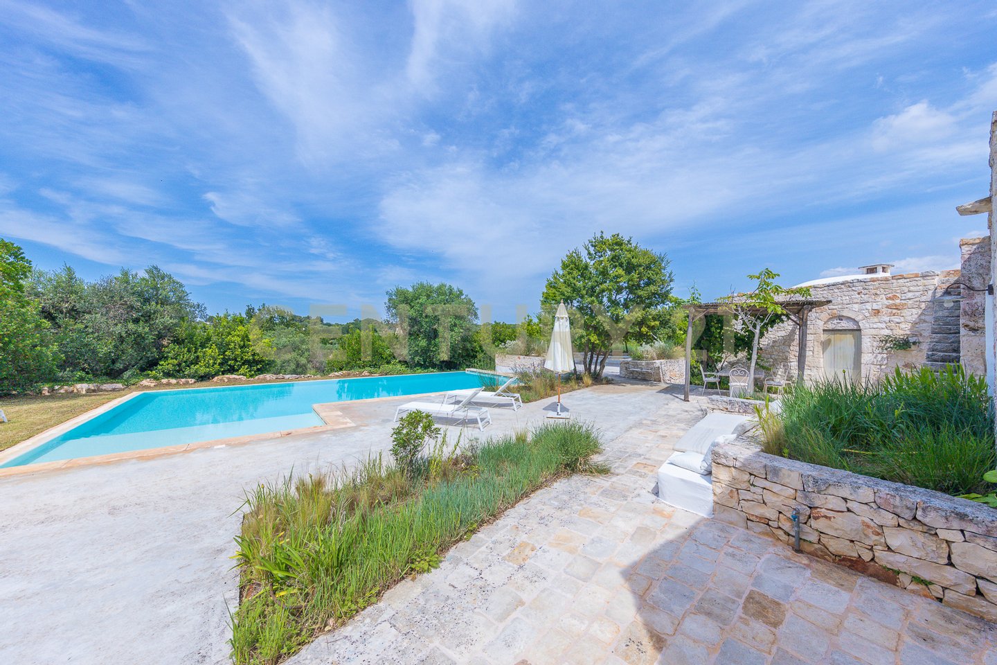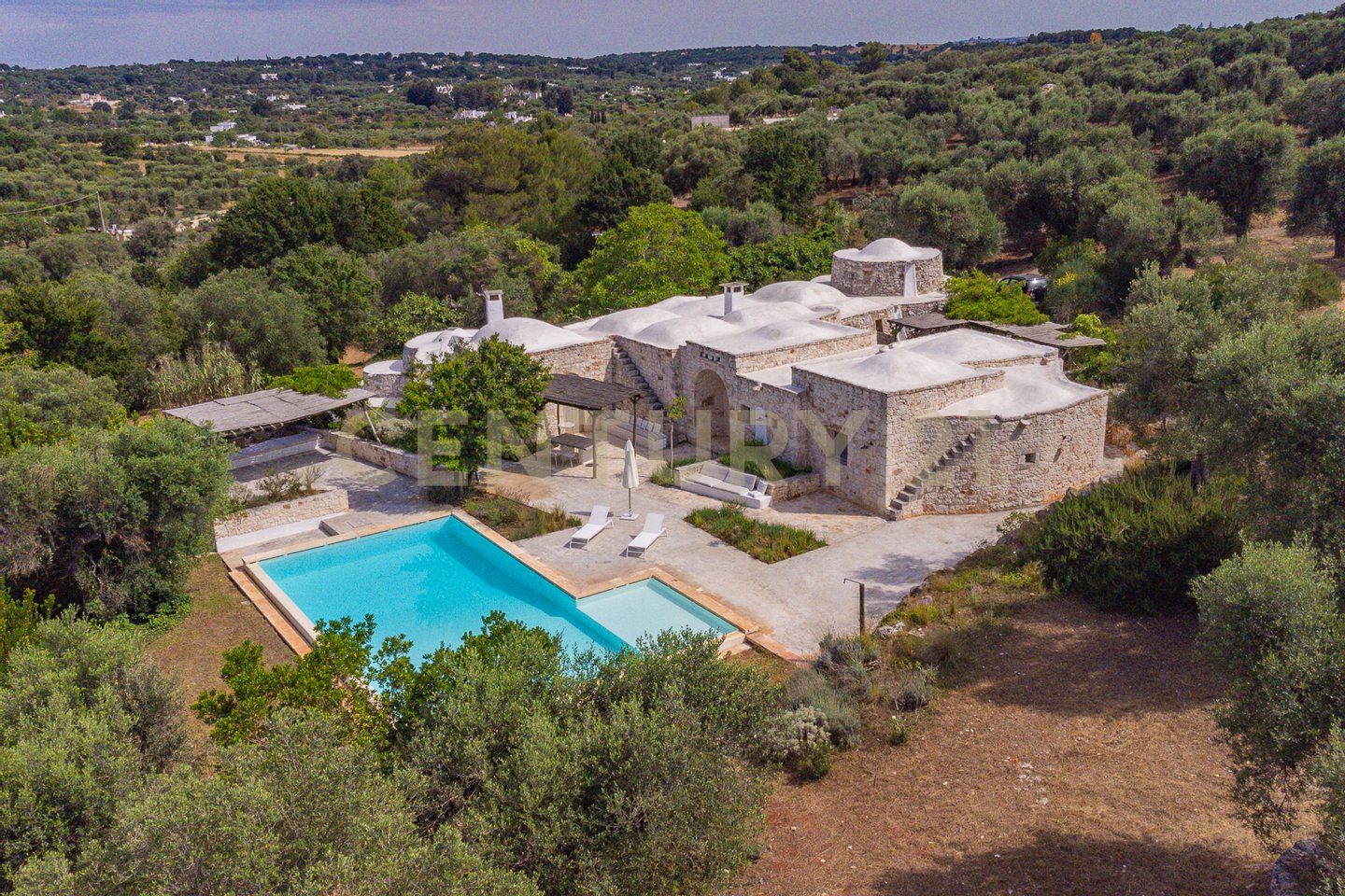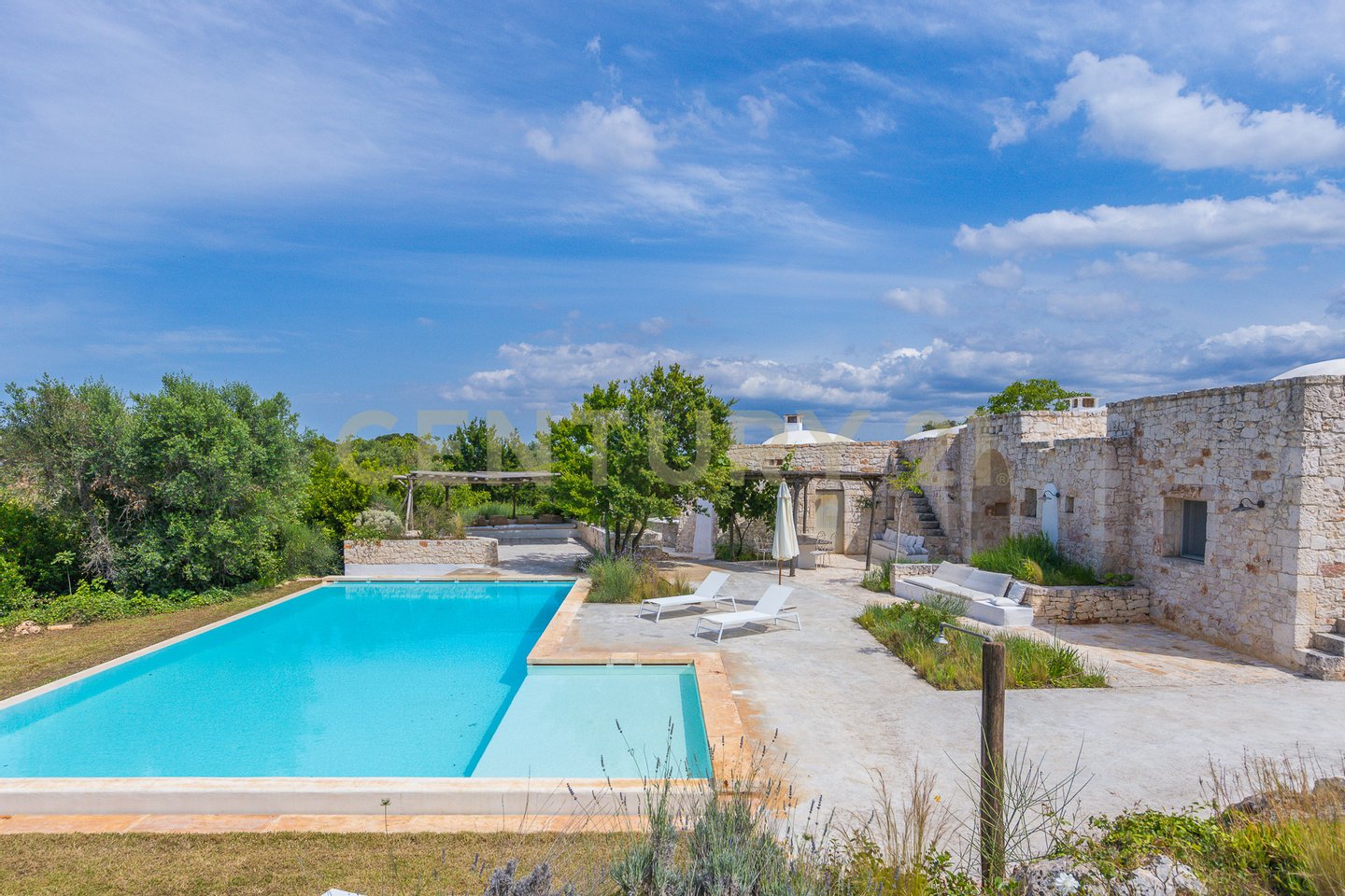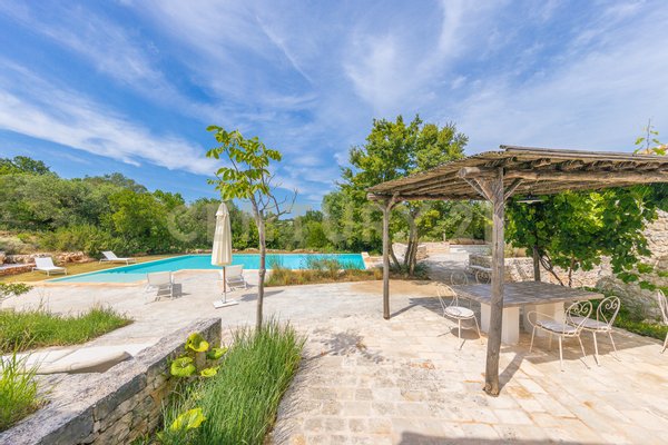 The villa is surrounded by centuries-old trees and Mediterranean scrub, creating an oasis of peace and tranquility. The outdoor spaces, equipped with pergolas and seating areas, offer a perfect setting to relax and enjoy the panoramic views of the countryside and the pool. The natural light reflecting on the white stone enhances the unique charm of this residence, giving a welcoming and serene atmosphere.