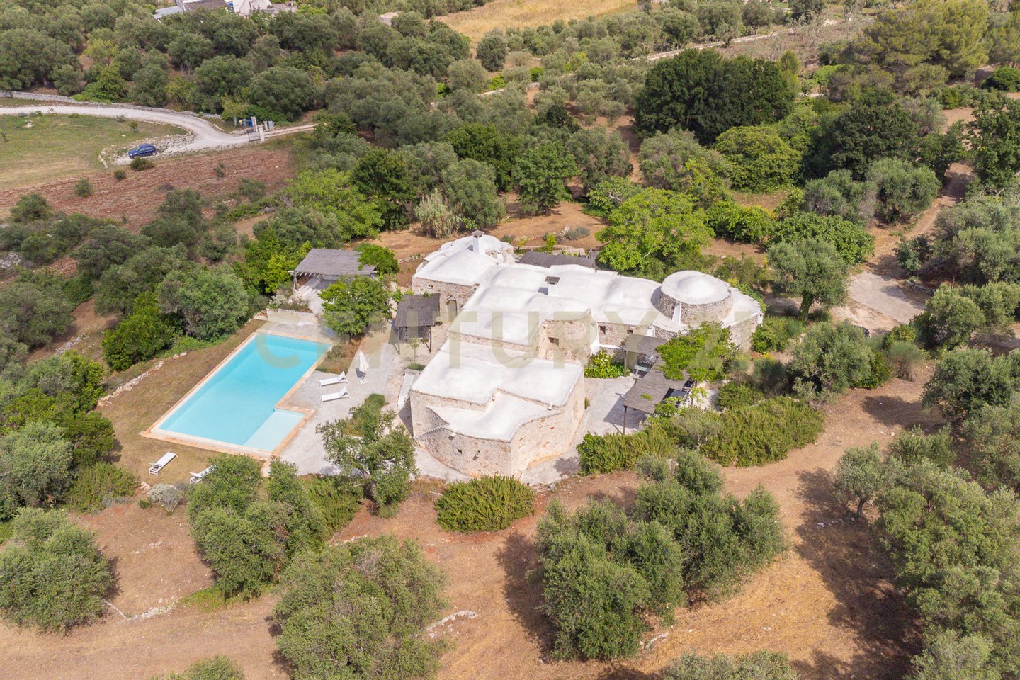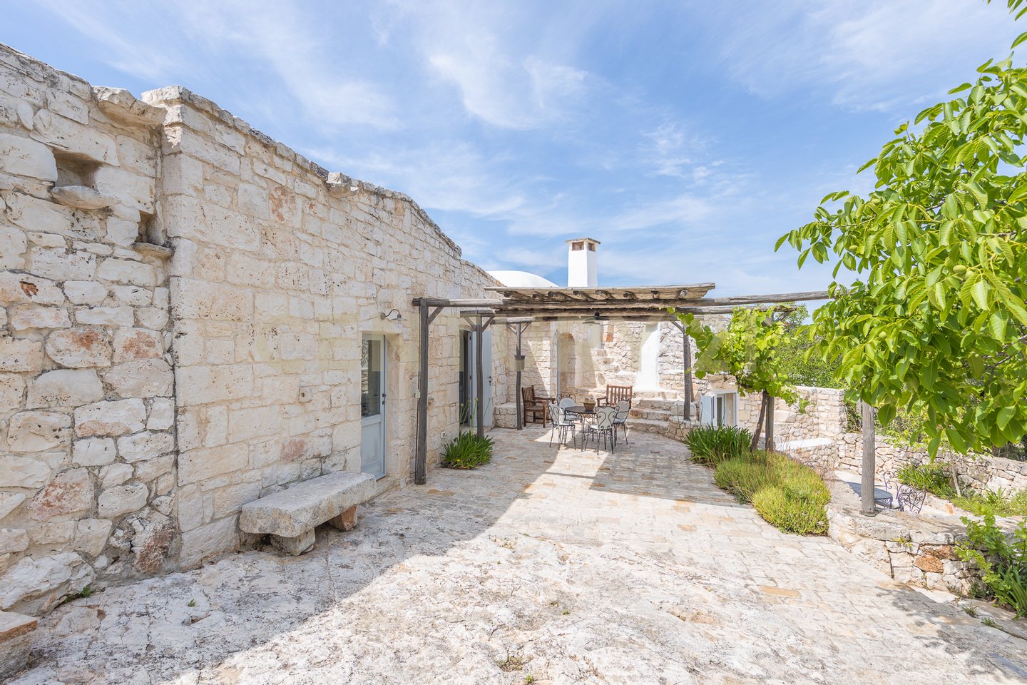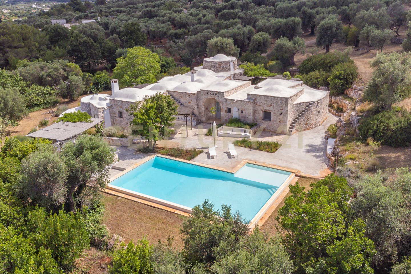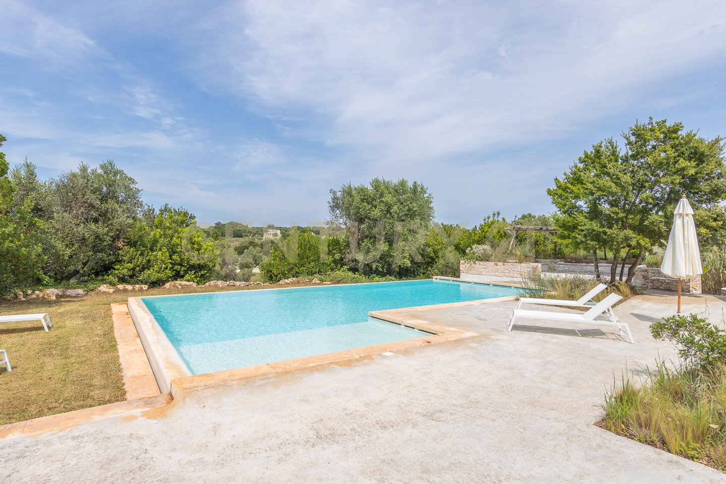 The villa is surrounded by centuries-old trees and Mediterranean scrub, creating an oasis of peace and tranquility. The outdoor spaces, equipped with pergolas and seating areas, offer a perfect setting to relax and enjoy the panoramic views of the countryside and the pool. The natural light reflecting on the white stone enhances the unique charm of this residence, giving a welcoming and serene atmosphere.
