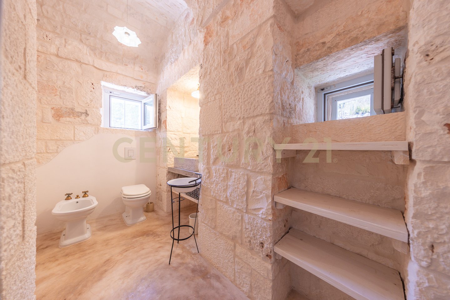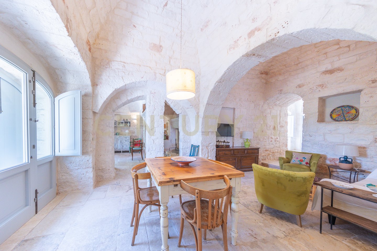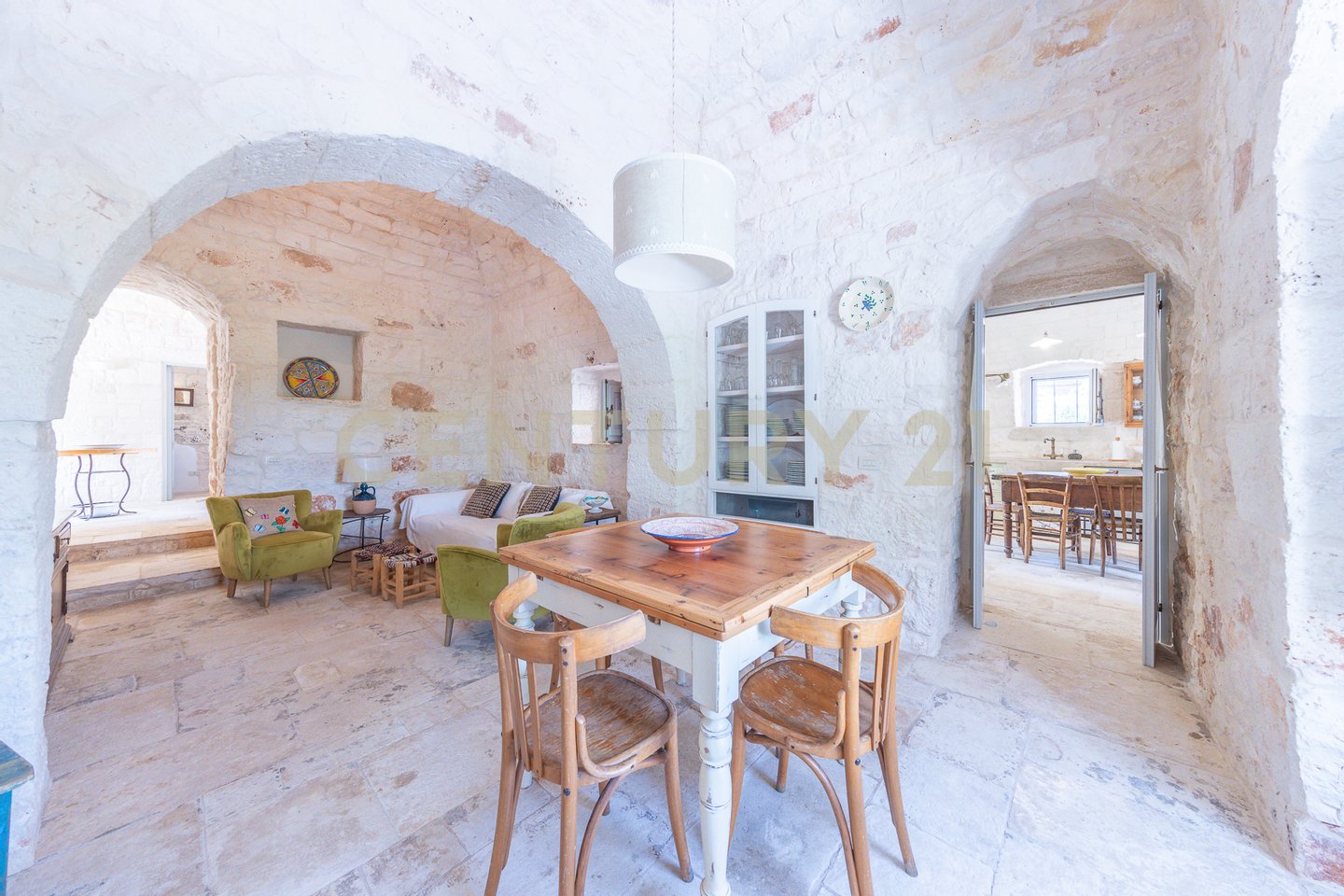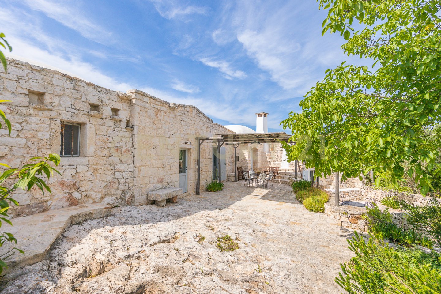 The villa is surrounded by centuries-old trees and Mediterranean scrub, creating an oasis of peace and tranquility. The outdoor spaces, equipped with pergolas and seating areas, offer a perfect setting to relax and enjoy the panoramic views of the countryside and the pool. The natural light reflecting on the white stone enhances the unique charm of this residence, giving a welcoming and serene atmosphere.