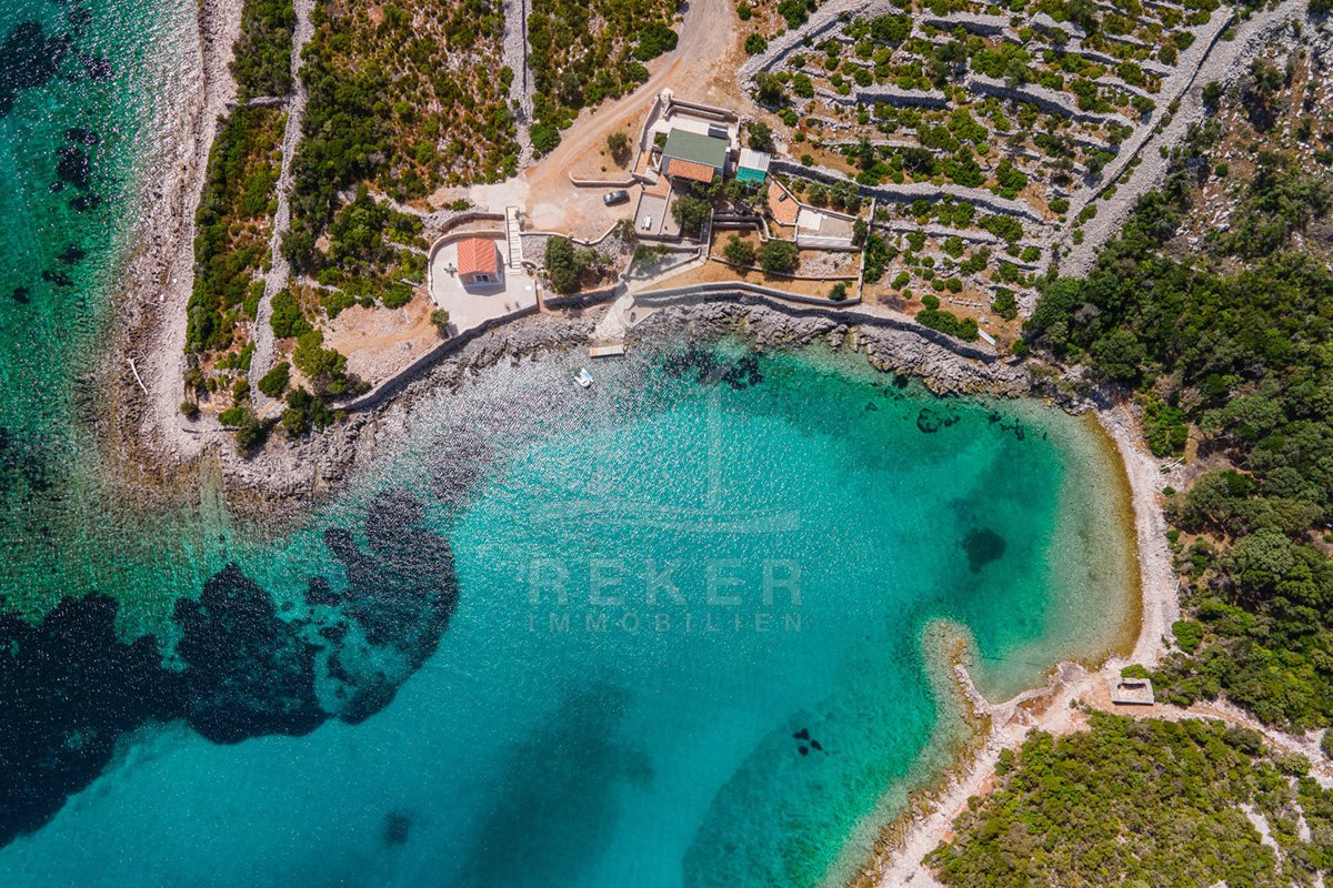 Sie erwerben 42.000 m² Privatgrundstück in erster Reihe zum Meer … mit eigener Bucht und großem Privatstrand. In der gesamten Bucht befinden sich nur diese zwei Häuser. Sichere Bootsanlage direkt neben dem Haus inklusive. Sie investieren in ein seltenes Gesamtpaket aus Natur, Privatsphäre und funktionierender Infrastruktur. In einer der begehrtesten Lagen der Insel Lošinj.