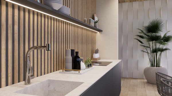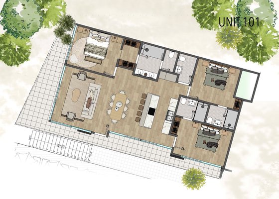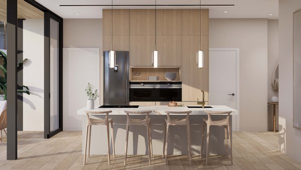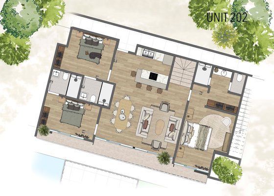 Die Einheiten im Erdgeschoss bestehen ausschließlich aus drei Schlafzimmern, während die Einheiten im zweiten Stock drei Schlafzimmer sowie ein viertes Schlafzimmer im dritten Stock sowie eine Terrasse und Außenterrassen in der Küche haben.