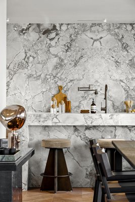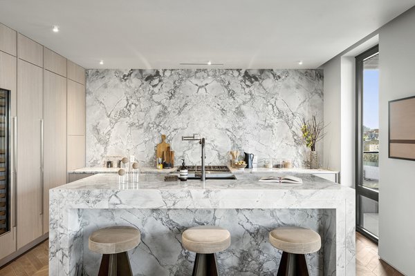 The chef's kitchen is defined by the striking Cristallo quartzite countertop and full backsplash. Both art and architecture, this masterpiece anchors the open kitchen with timeless sophistication. Custom millwork discreetly conceals a Sub-Zero refrigerator and a temperature-controlled wine cooler, while a Wolf gas range, wall oven, Cove dishwasher, and speed oven create a dream setup. Convenient storage keeps every appliance within easy reach and neatly out of sight.