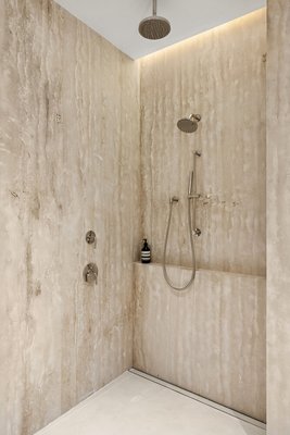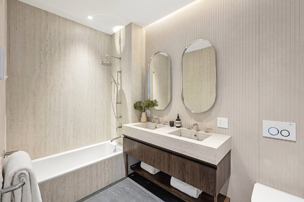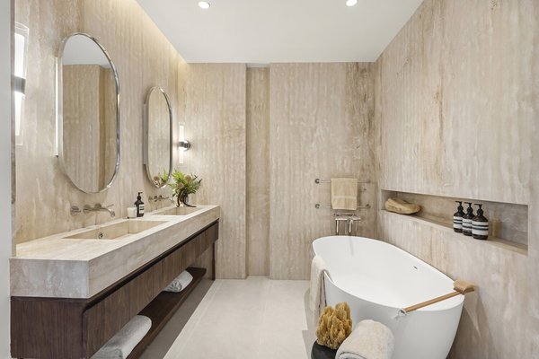 The residential wing features three well-proportioned bedrooms, including a serene primary suite with a spacious walk-in closet and a spa-inspired bathroom. Offering radiant heated floors and clad in full travertine, the en suite is centered by a sculptural freestanding soaking tub and complemented by a double vanity and rain shower. Every element is finished with elegant Waterworks fixtures, creating the perfect retreat. Two additional bedrooms, each with ample closet space, share a beautifully appointed secondary bathroom that is finished with Dekton walls and floors. A laundry closet is conveniently positioned along the corridor.